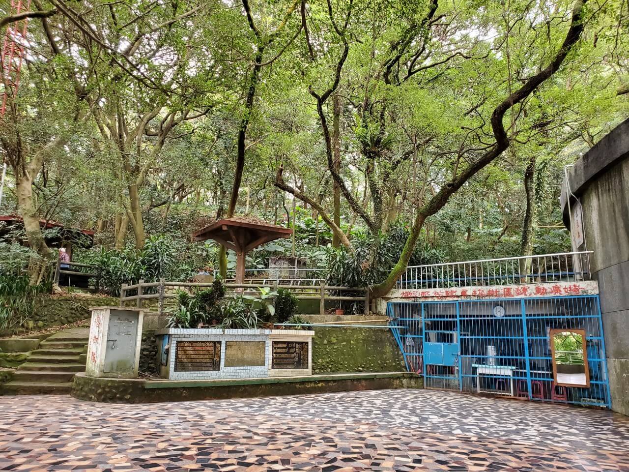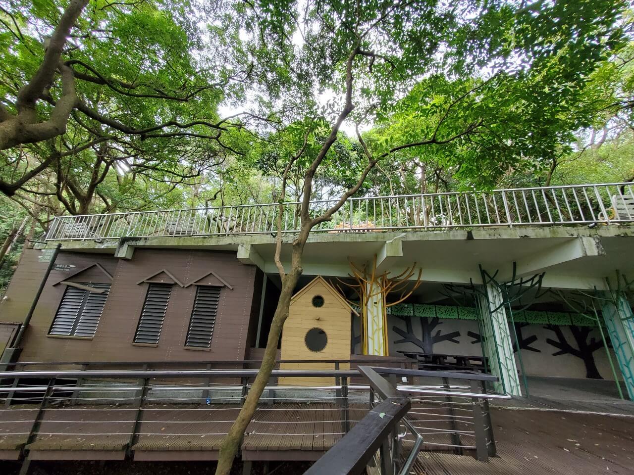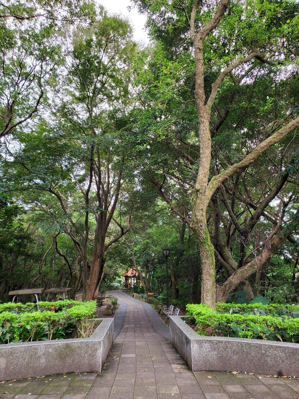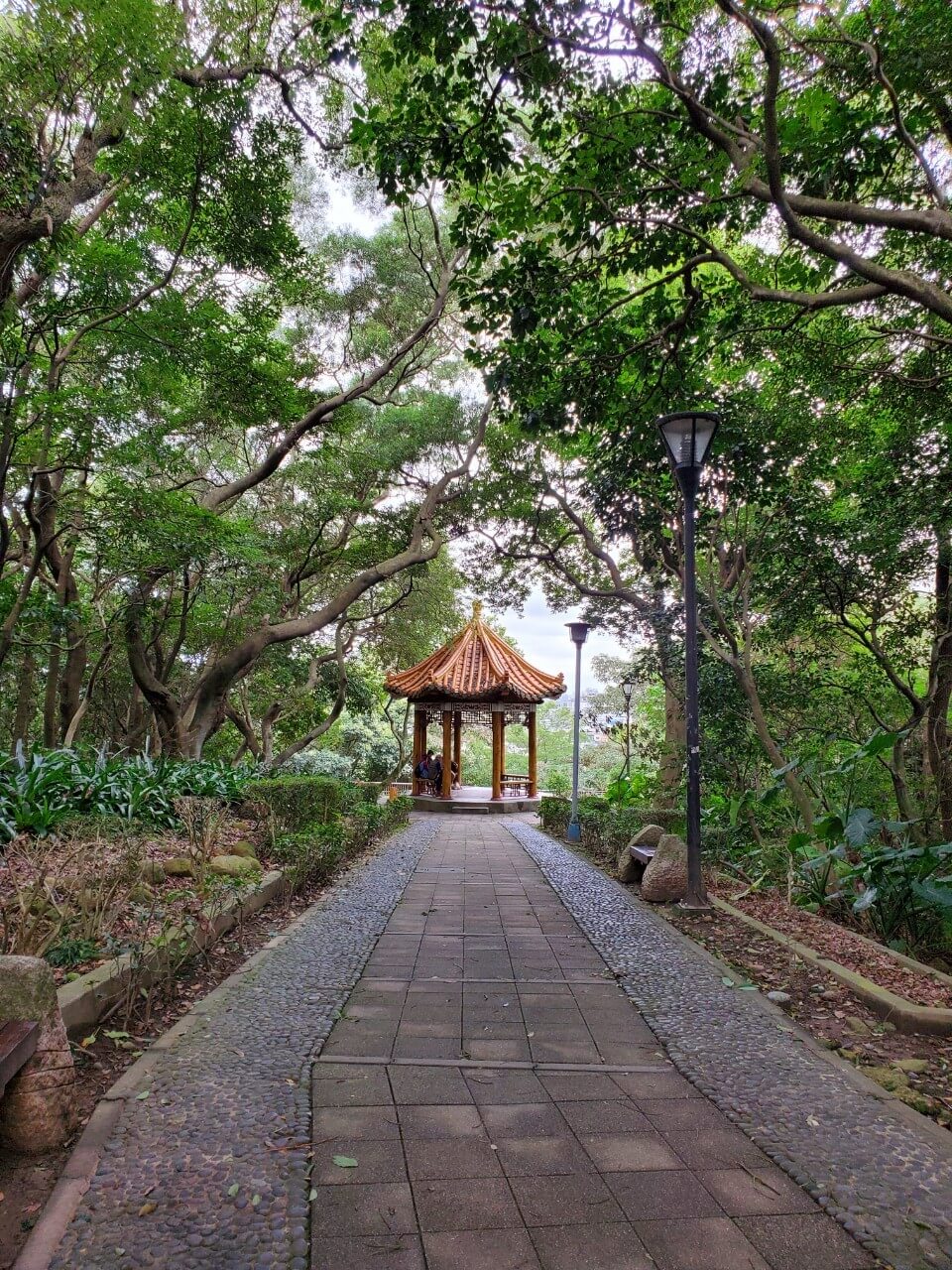 在這個中式涼亭前方,有一個類似觀景台的地方,隱約能看到視野挺不錯的,但是兩旁的樹長得又高又大,能看到的地方還真是有點少啊
