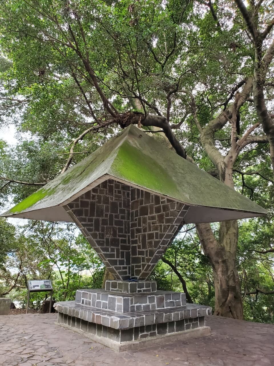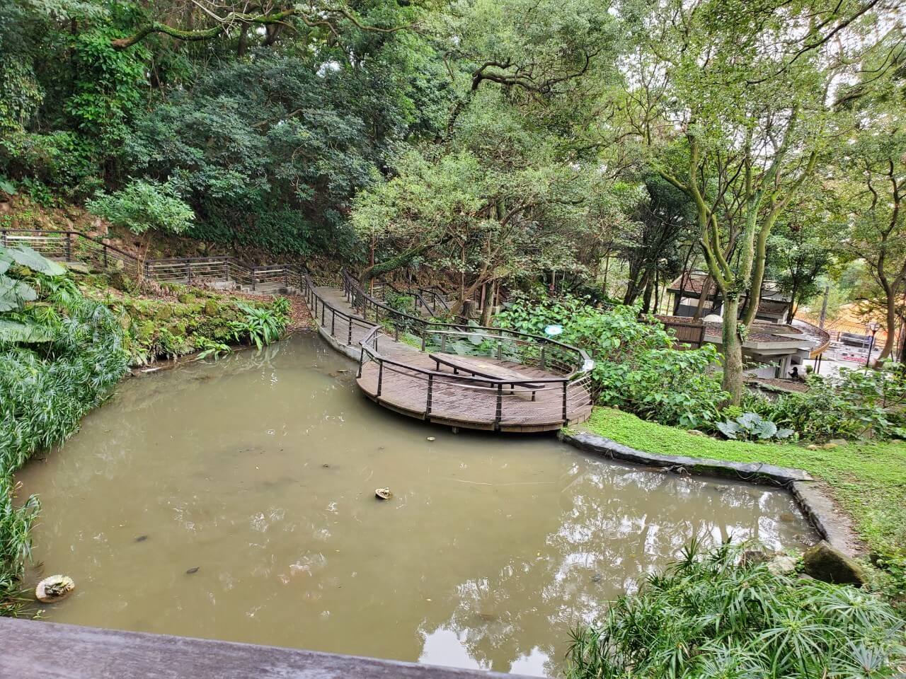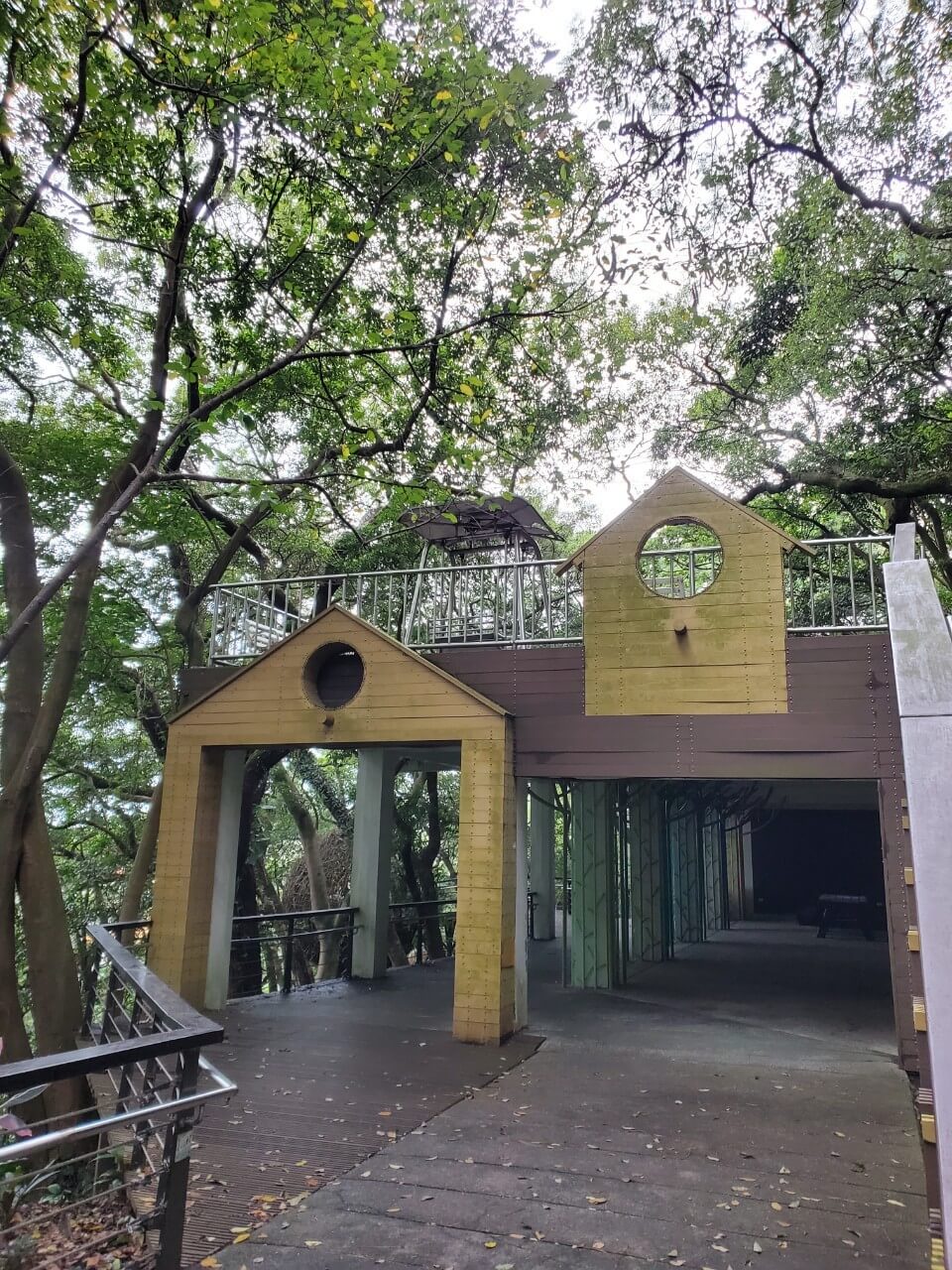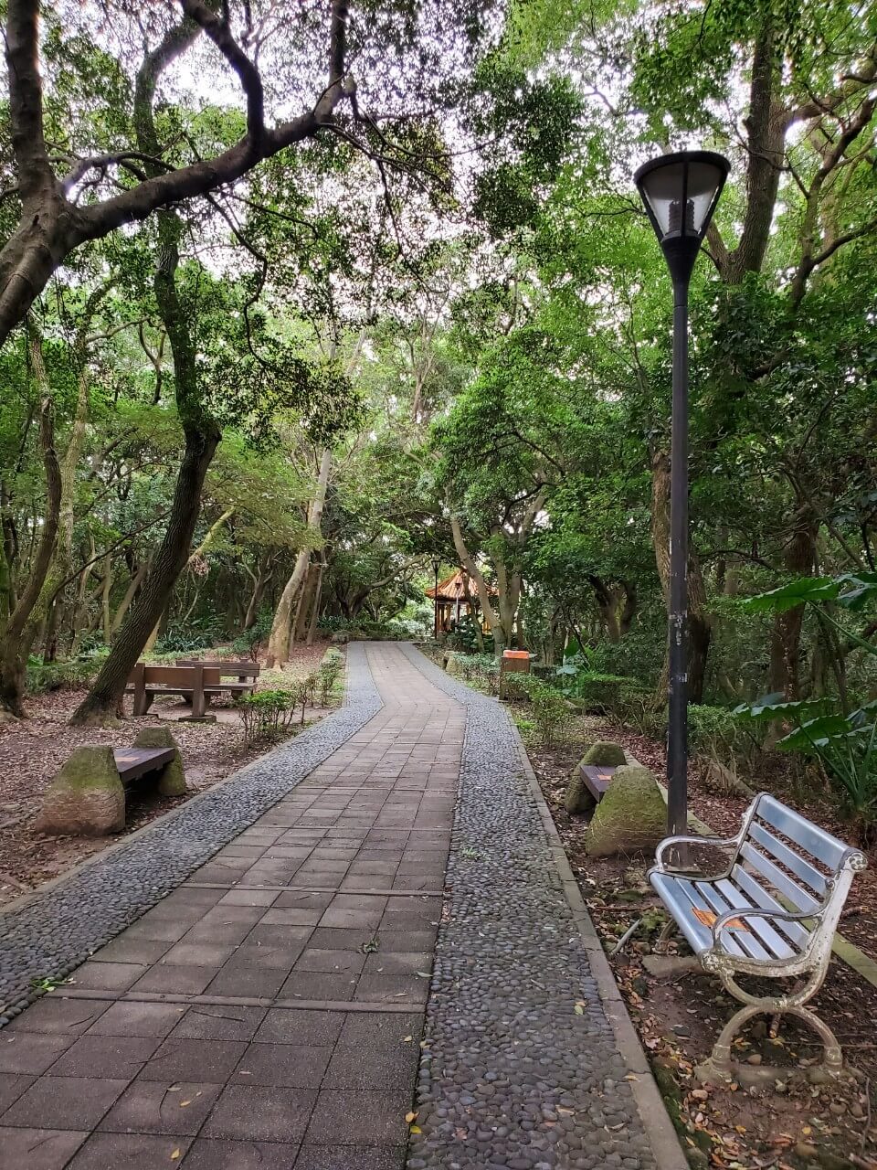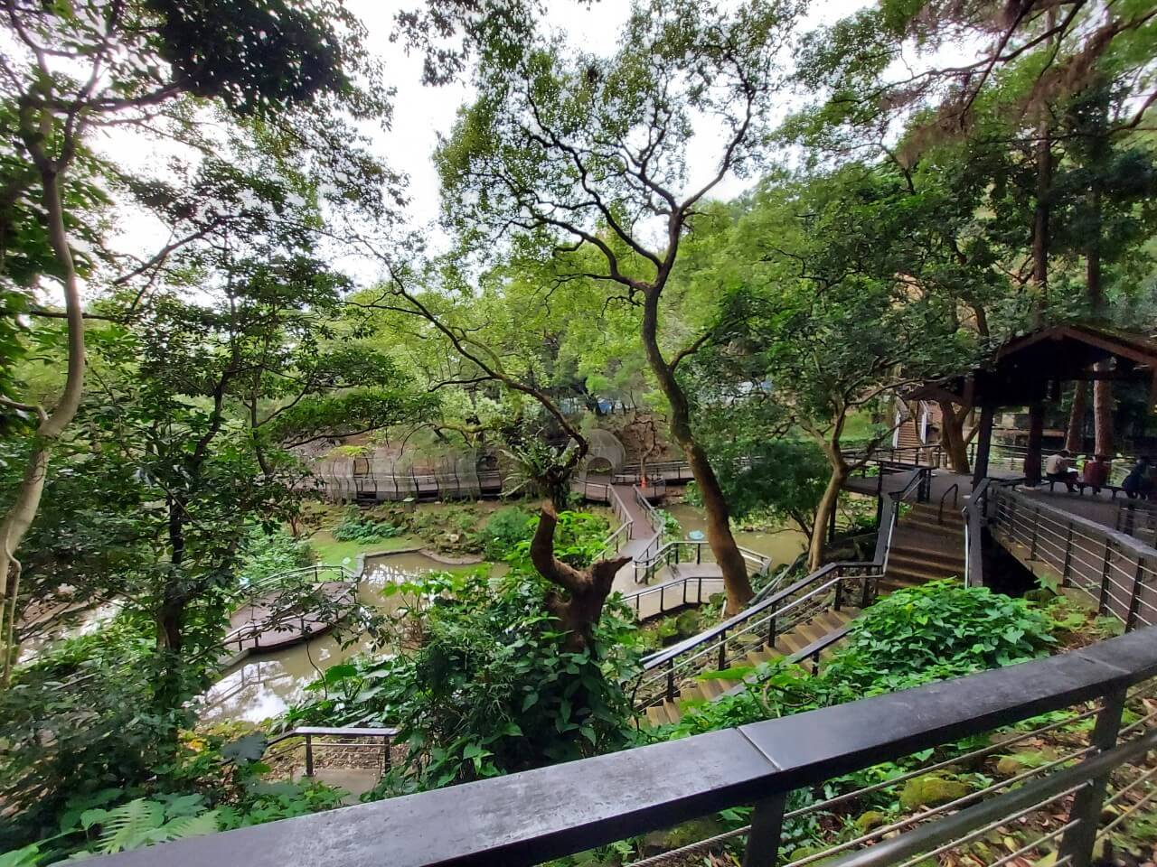 在這個中式涼亭前方,有一個類似觀景台的地方,隱約能看到視野挺不錯的,但是兩旁的樹長得又高又大,能看到的地方還真是有點少啊