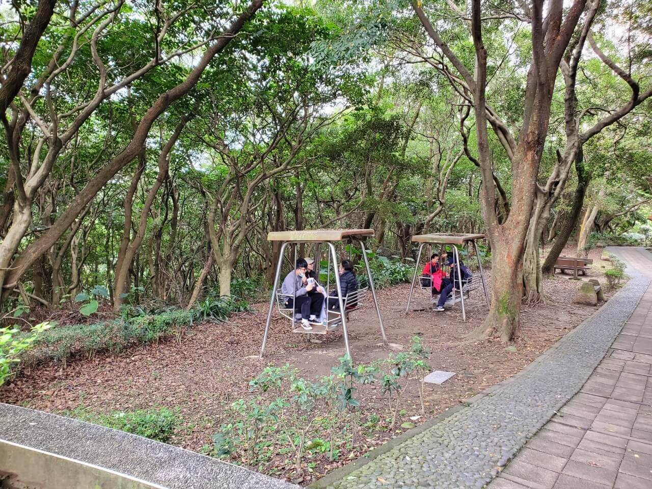 步道兩旁也有設置滿多石椅子,一家人走走看看累了還能坐著稍作休息,還挺不錯的,一旁還有看到鐵欄杆做的搖椅,小時候常常看到都當成盪鞦韆在搖,但是近幾年越來越少看到了