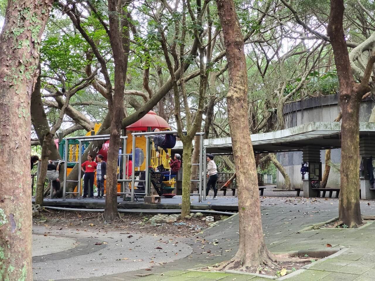 再往前走看到了兒童遊樂器材,不過看到的不是小朋友在跑來跑去玩樂的畫面,而是爺爺奶奶們邊聊天邊拉筋運動的畫面,爺爺奶奶們個個身體硬朗,連我這個年輕人都佩服不已