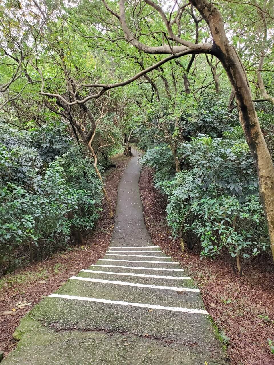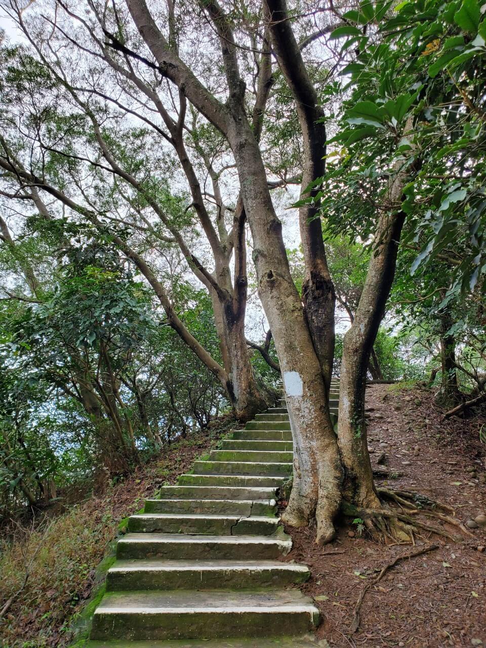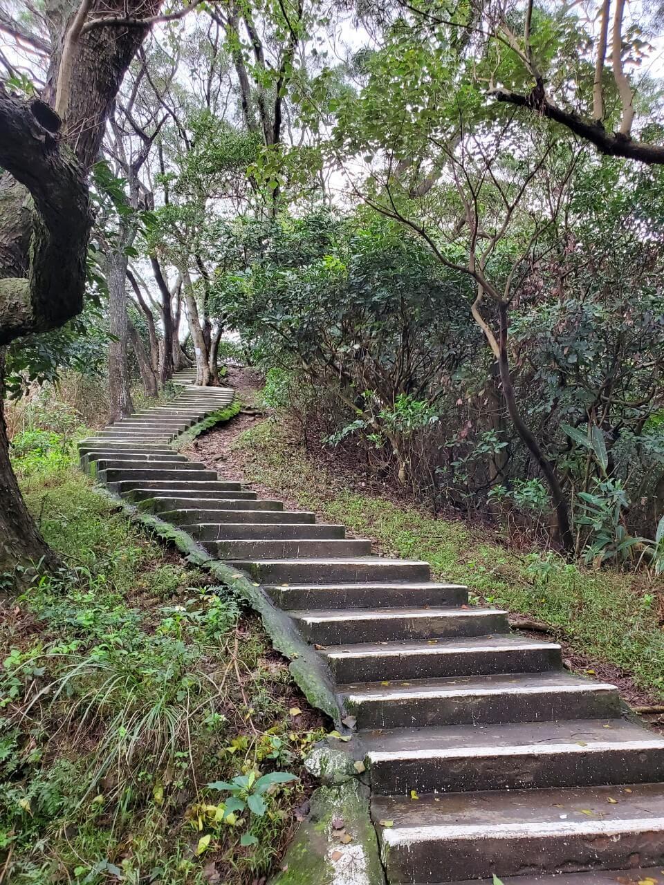 原本以為爬過前面的階梯以後,後面的步道都是斜坡,沒想到這裡竟然突然有幾格往下的階梯,不過很貼心的在每一格階梯都有塗上一條白色的油漆提醒大家,不然很容易一個不注意就踩空了