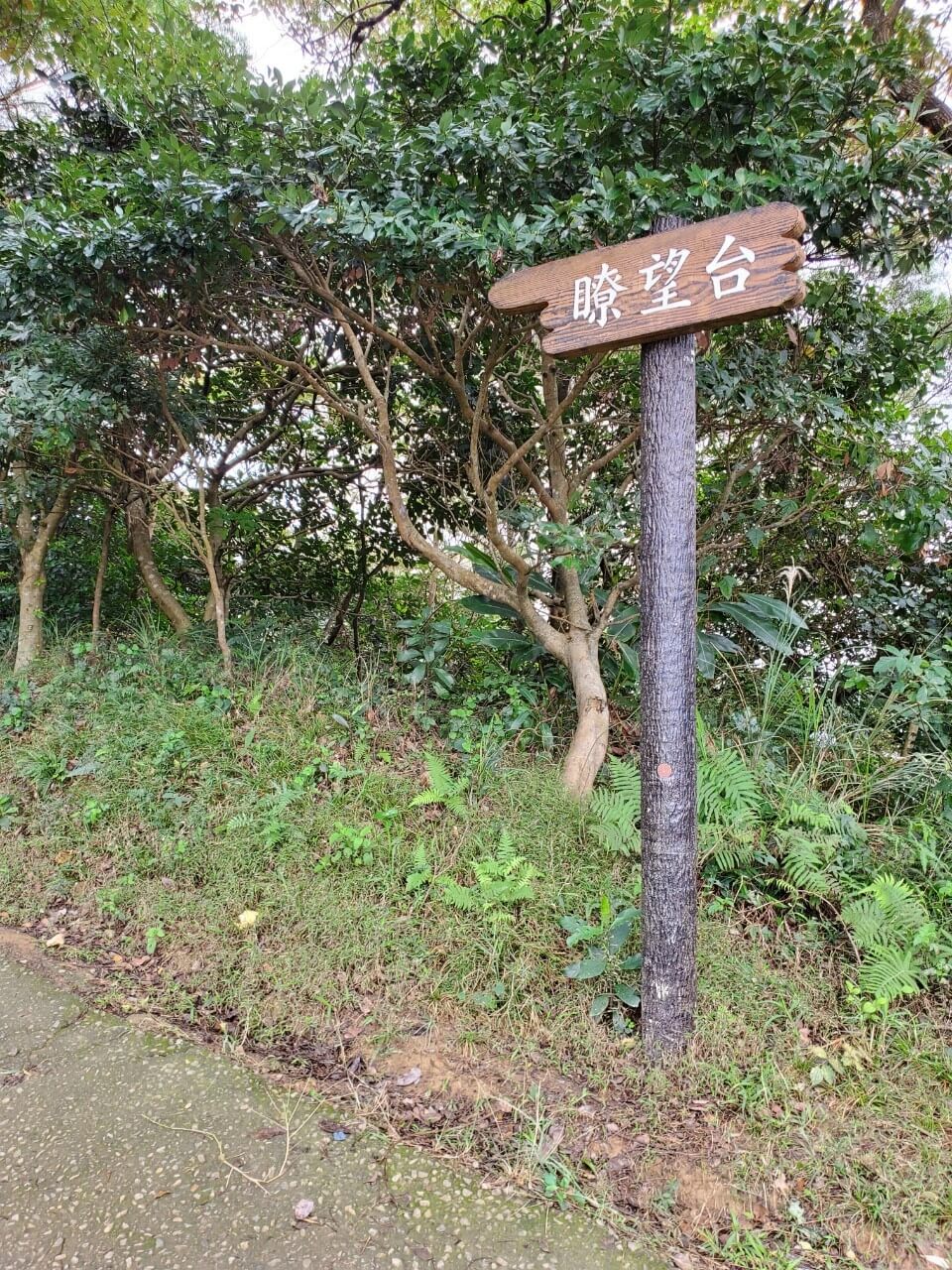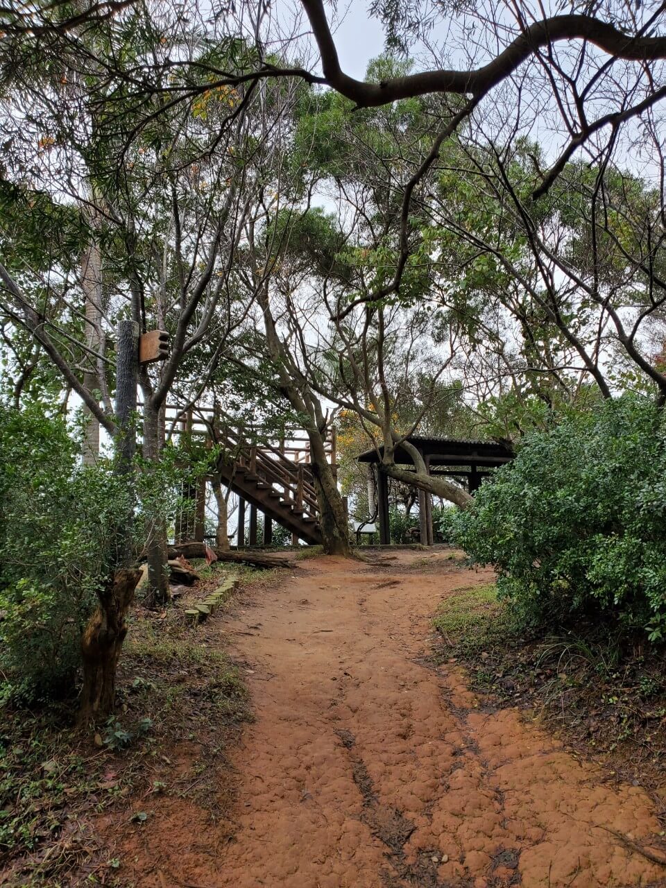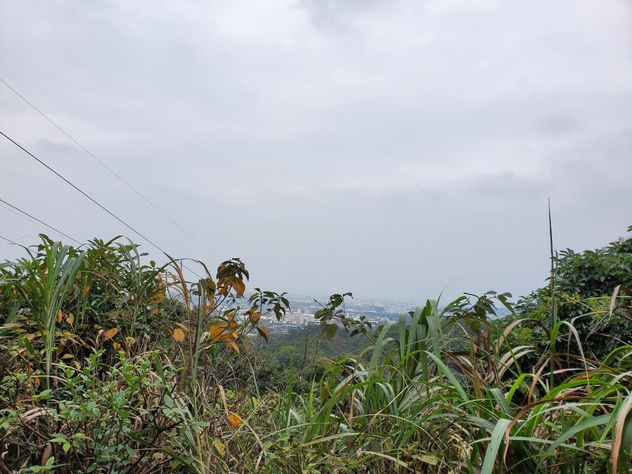 往前走沒多久,我們來到了五酒桶山步道裡第一個標的物「春秋亭」,從這裡就可以略微眺望山腳下的景色,不過一旁的植物長得太高,只能稍微看到一咪咪而已