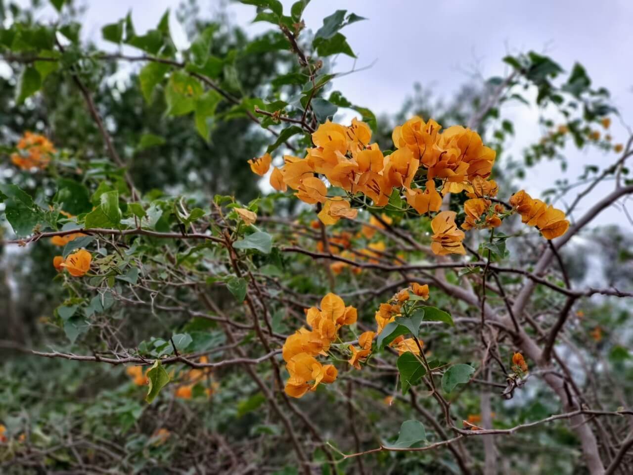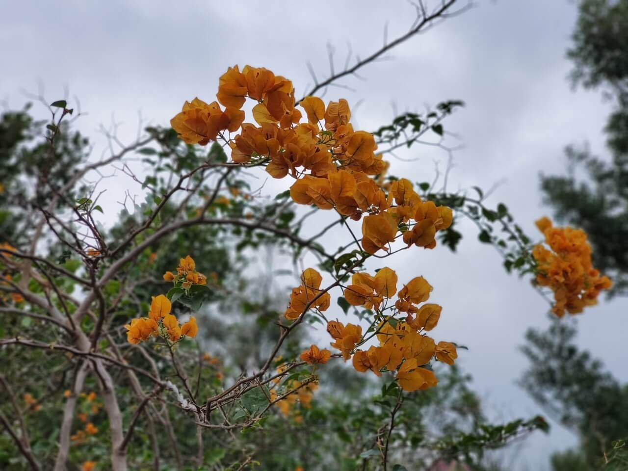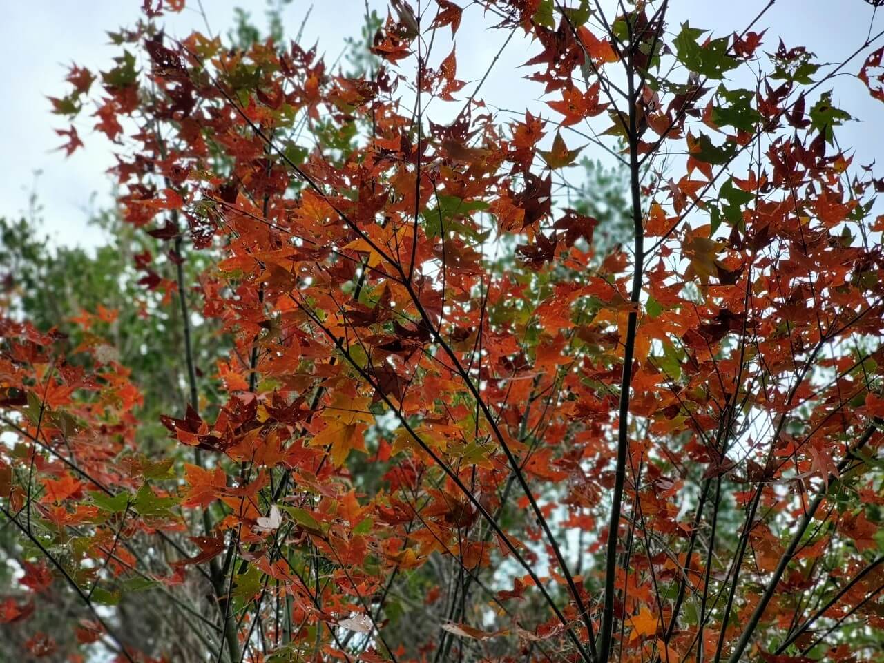 沒想到這裡竟然看得到楓葉,雖然只有一、兩棵,但也足夠讓我欣賞好一陣子,往瞭望台上走,一旁還有黃色的植物,雖然我不知道是花還是葉子,這裡和綠油油的步道不一樣,多了其他顏色,看起來特別漂亮