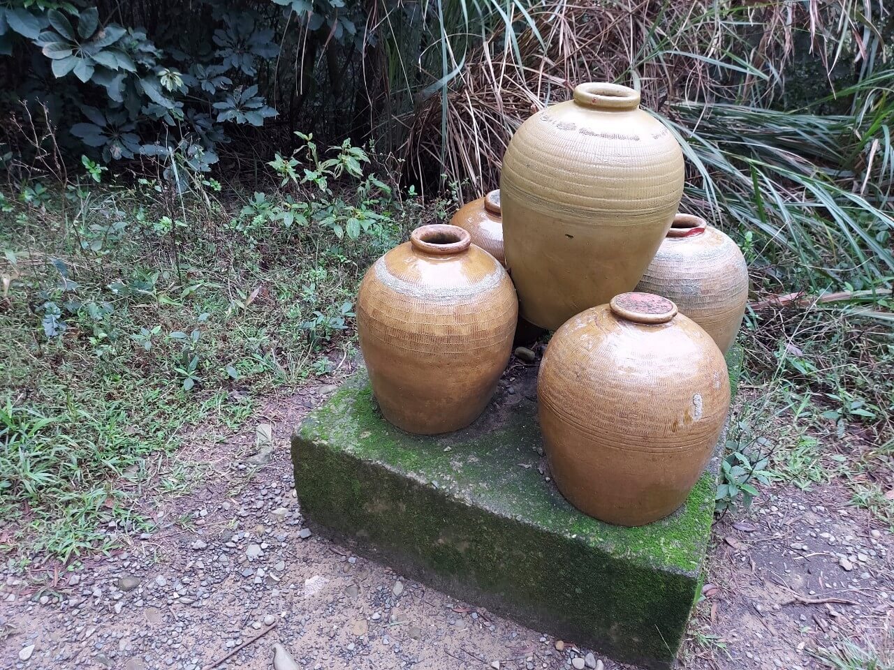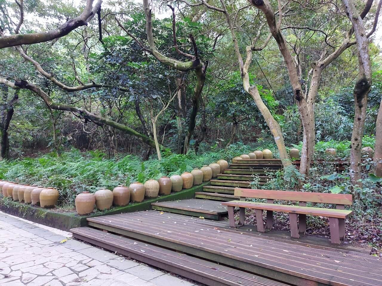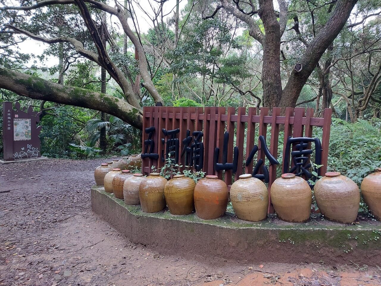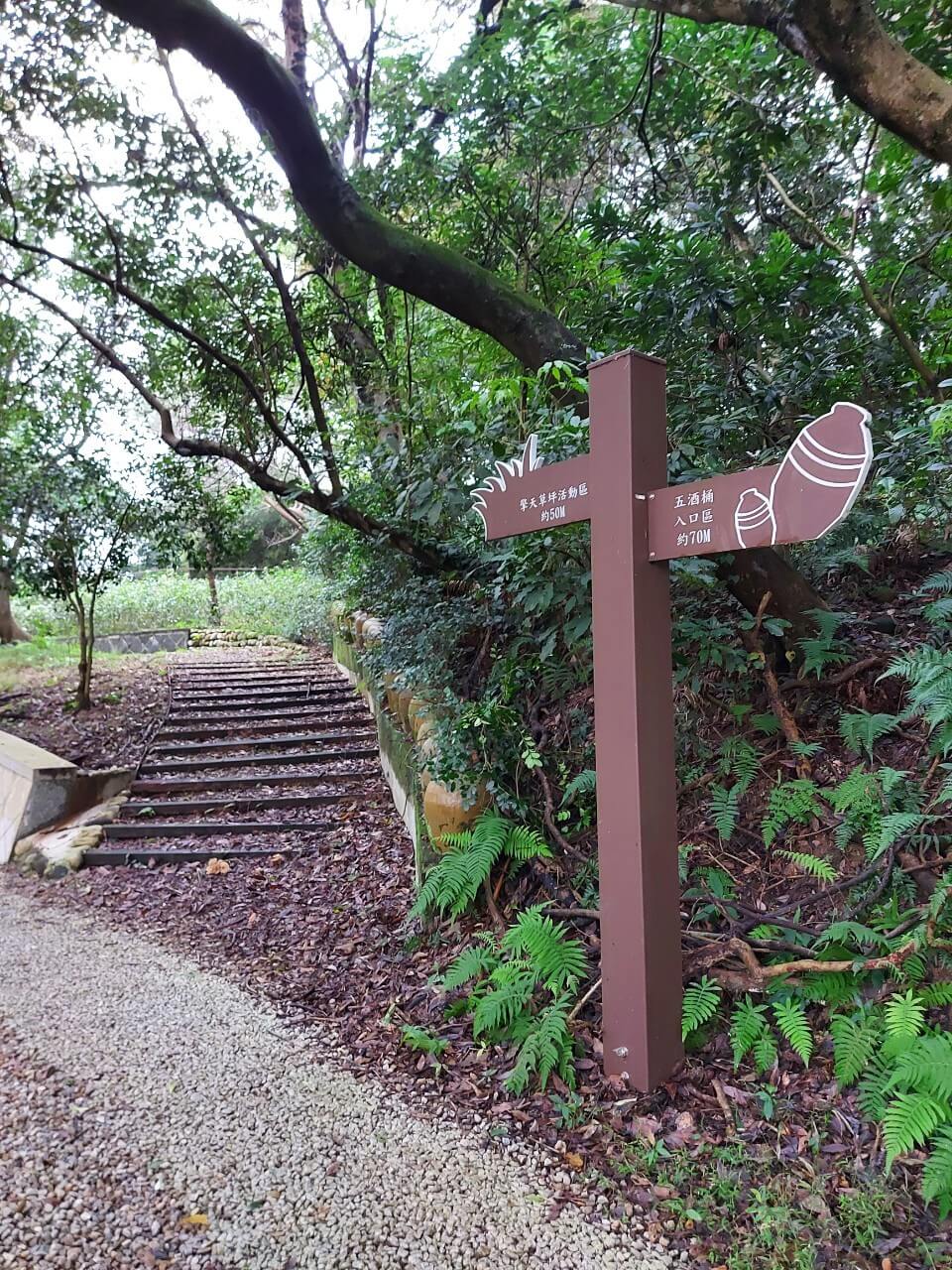 不知道走了多久,我們看到了第一個「五個酒桶」堆疊成的山,再來第二個、第三個,再繼續往前走就看到一整排有點壯觀的酒桶排排站,一旁則寫著「五酒桶山公園」