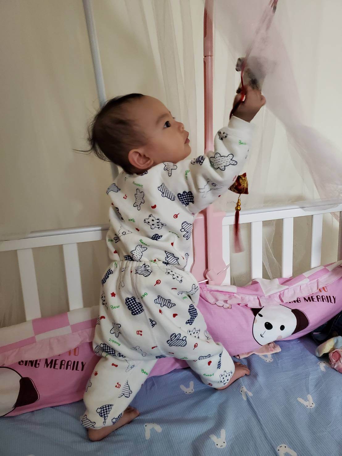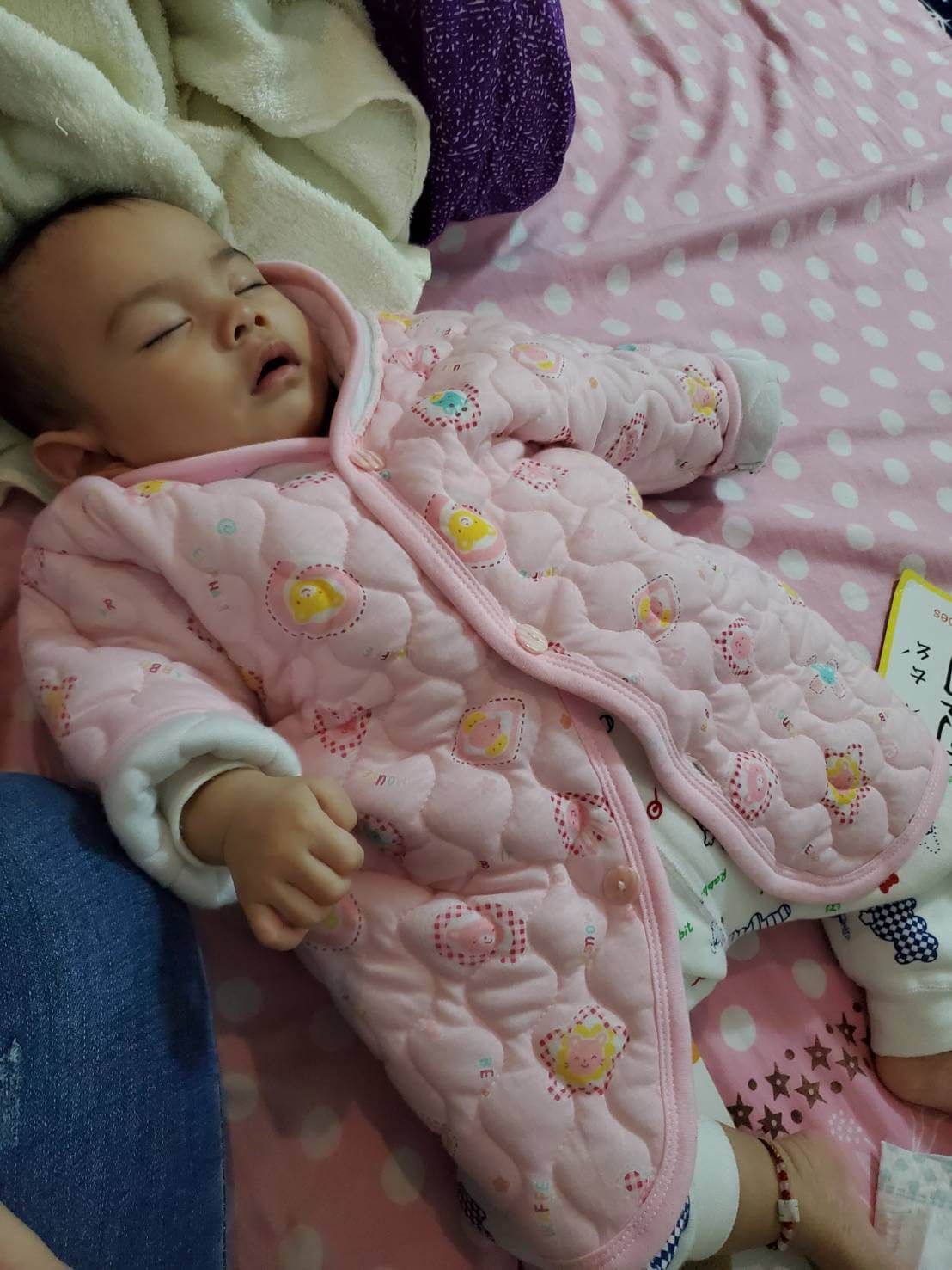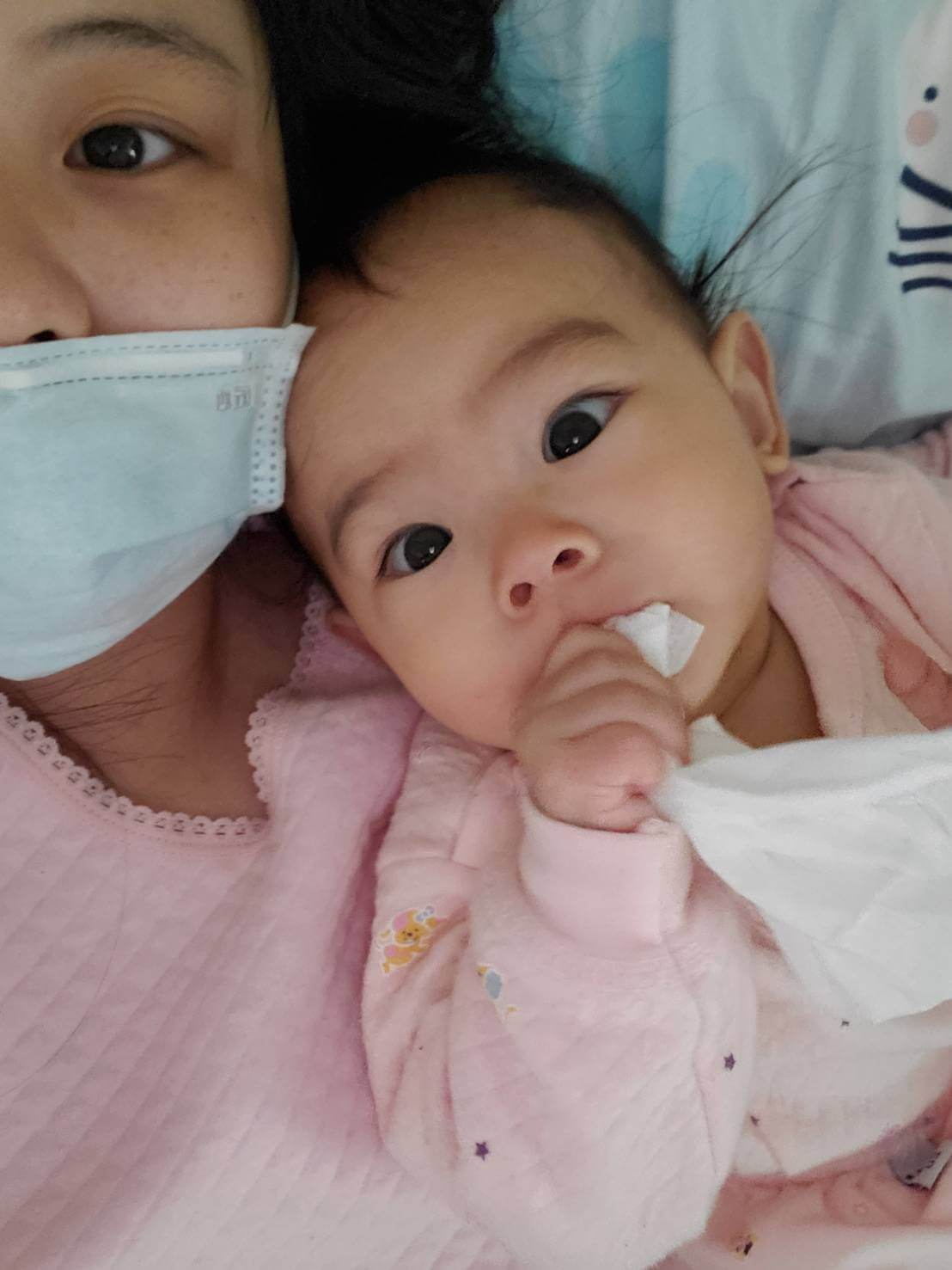 因為自己也感冒,擔心自己半夜咳嗽又在傳染給媛媛,所以24小時都戴著口罩,連睡覺也是,偏偏這個小朋友睡覺又很喜歡靠著,讓我覺得好可怕