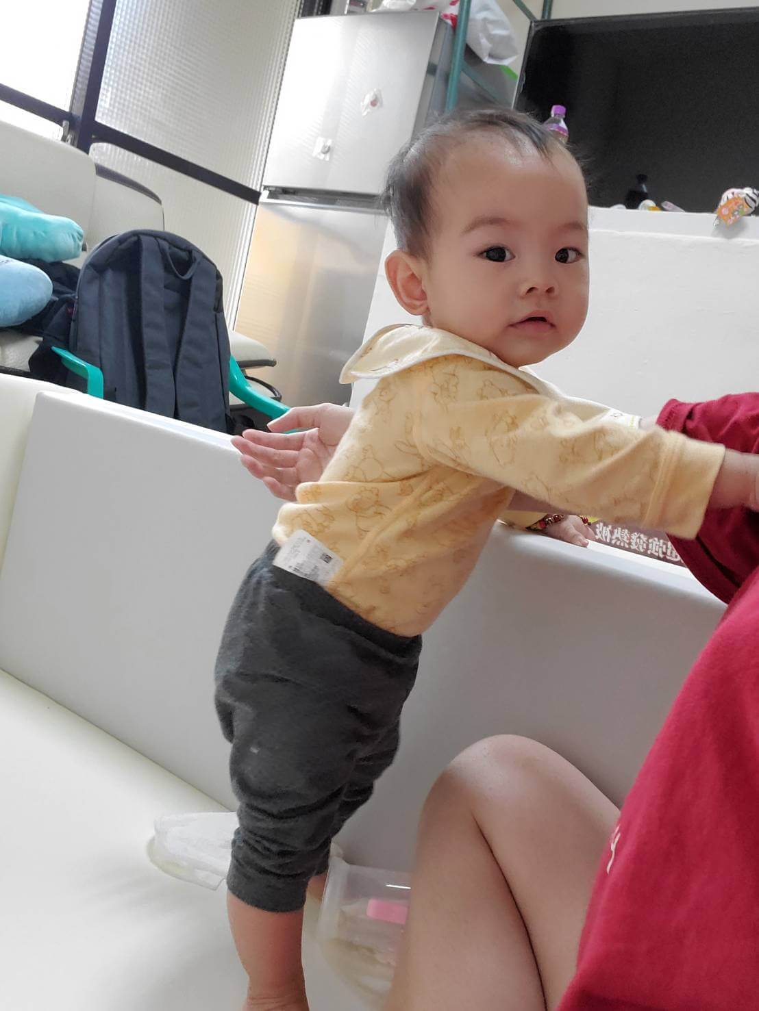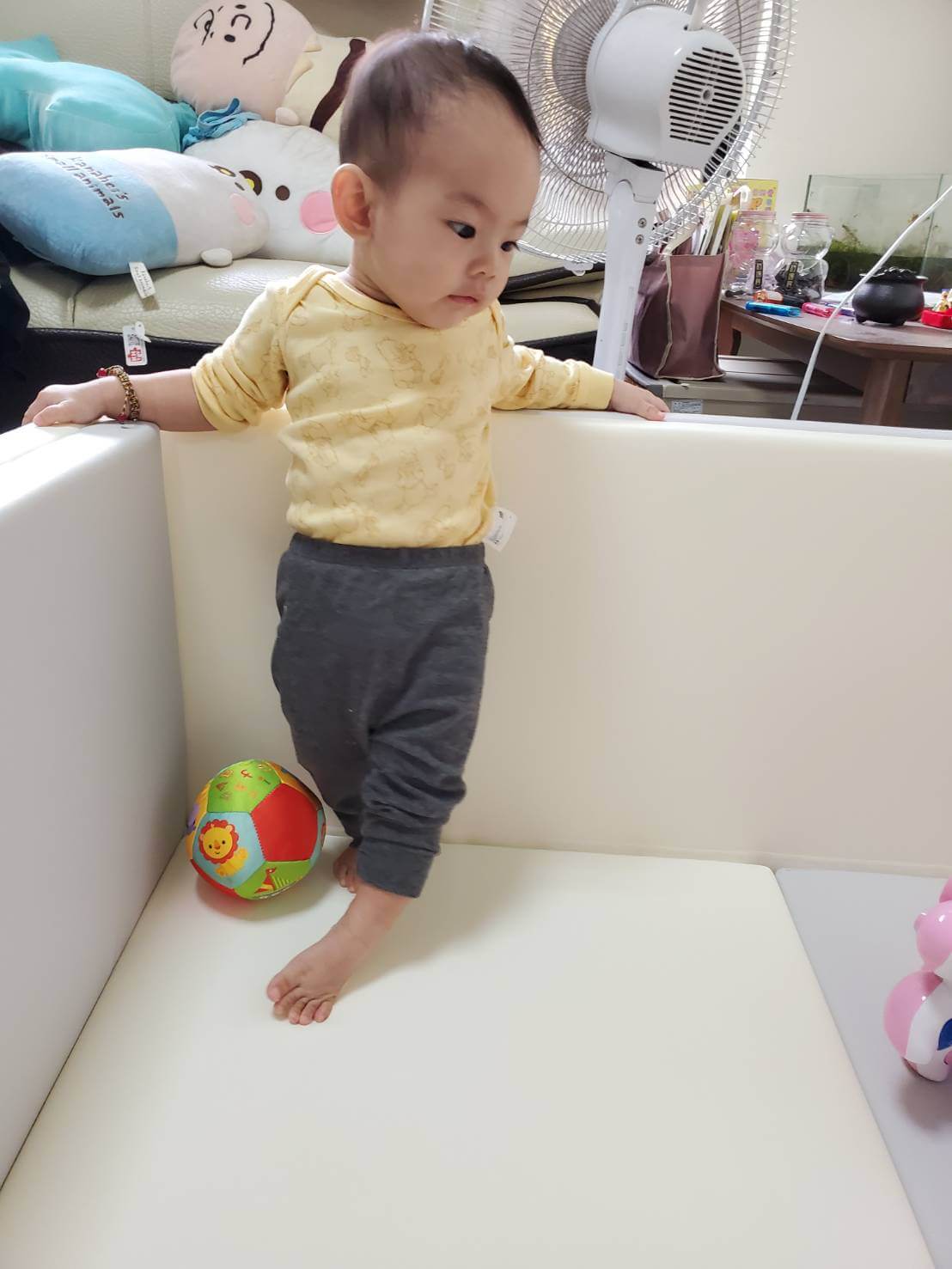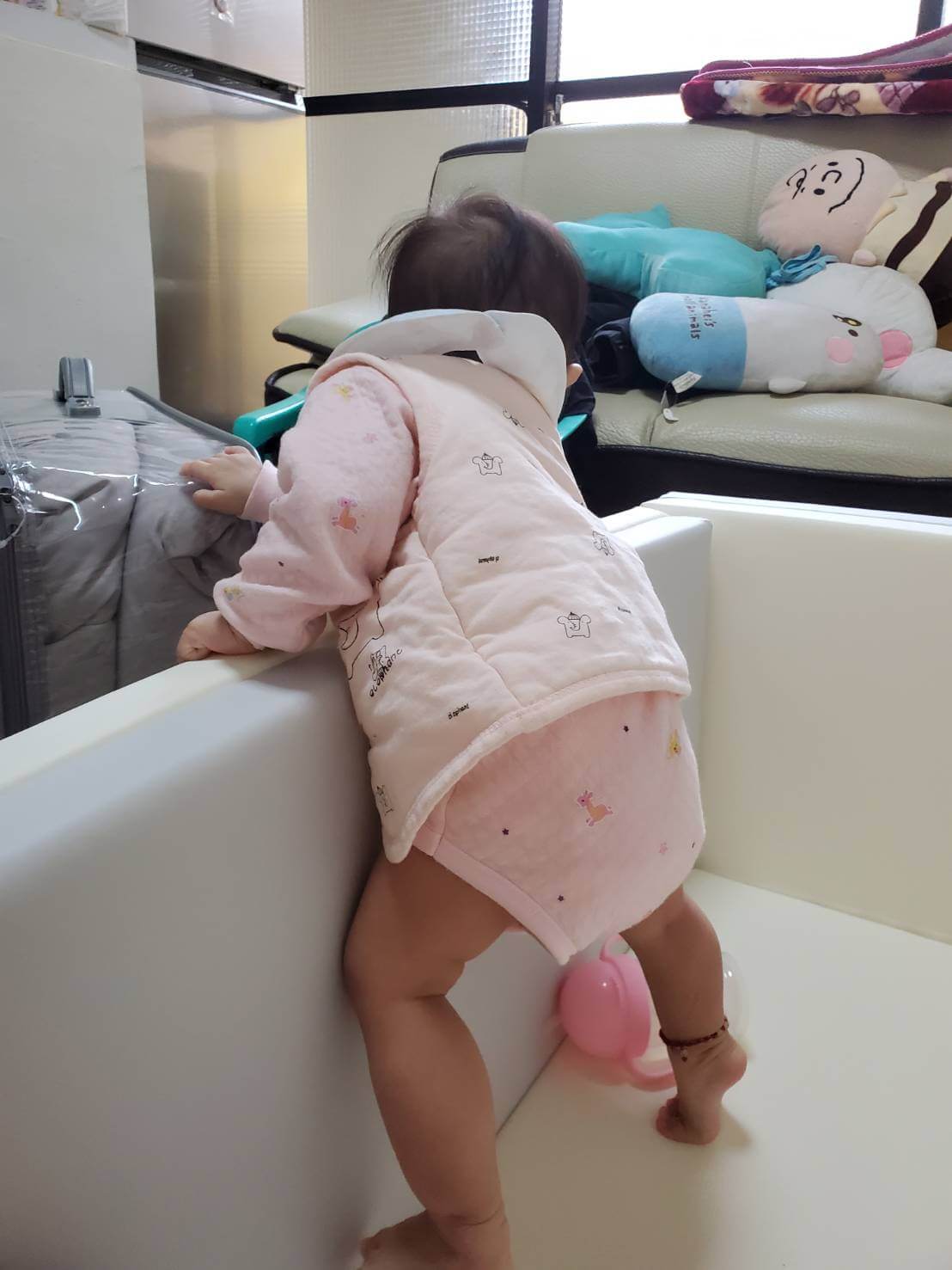 自從知道自己可以扶著站、扶著走以後,媛媛每天在地墊圍欄裡勤奮好學,靠著圍欄的高度一直努力練習扶走,怕她太累把她抱下坐好,三兩下又掙扎的要站起來走