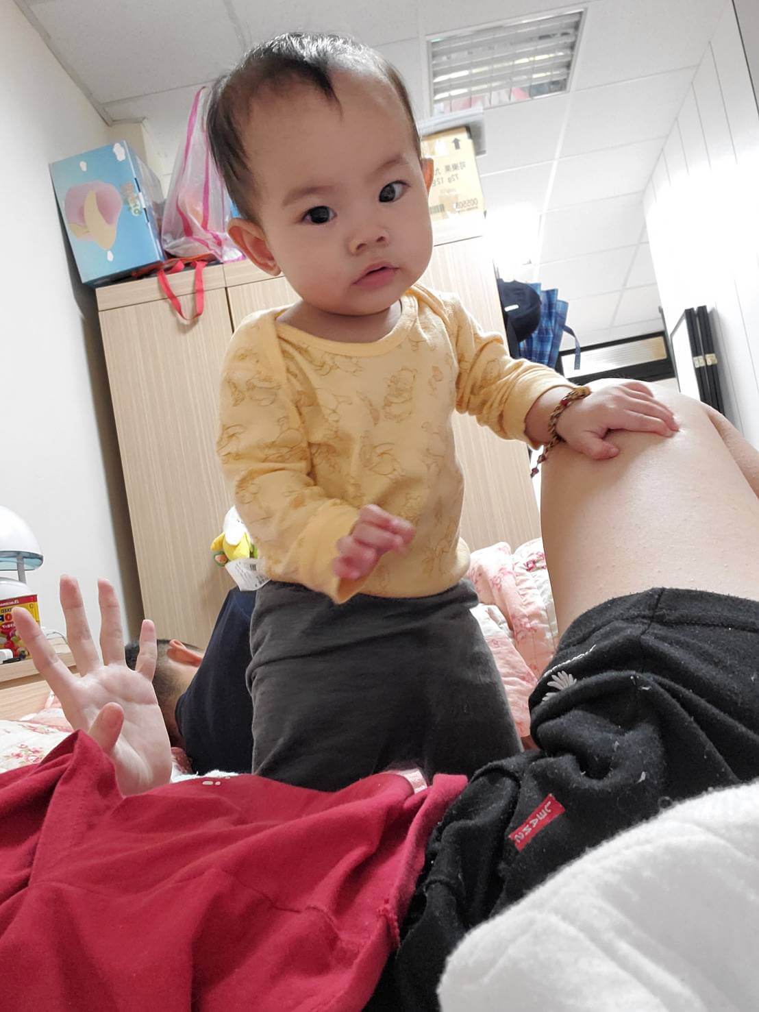 而最近除了她自己的位置外,還進攻到我們的床頭櫃,她的嬰兒床和我們的床有點高低差,我原本以為這樣子她可能下不來或是會跌倒,不過媛媛竟然可以穩穩的扶著慢慢走下來,真是讓我太佩服了