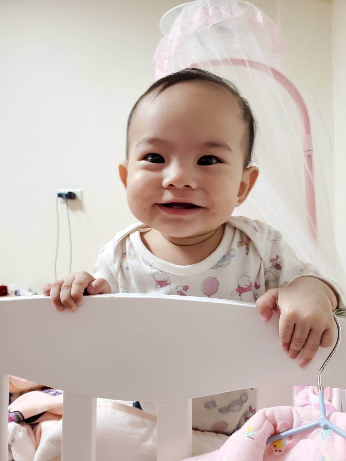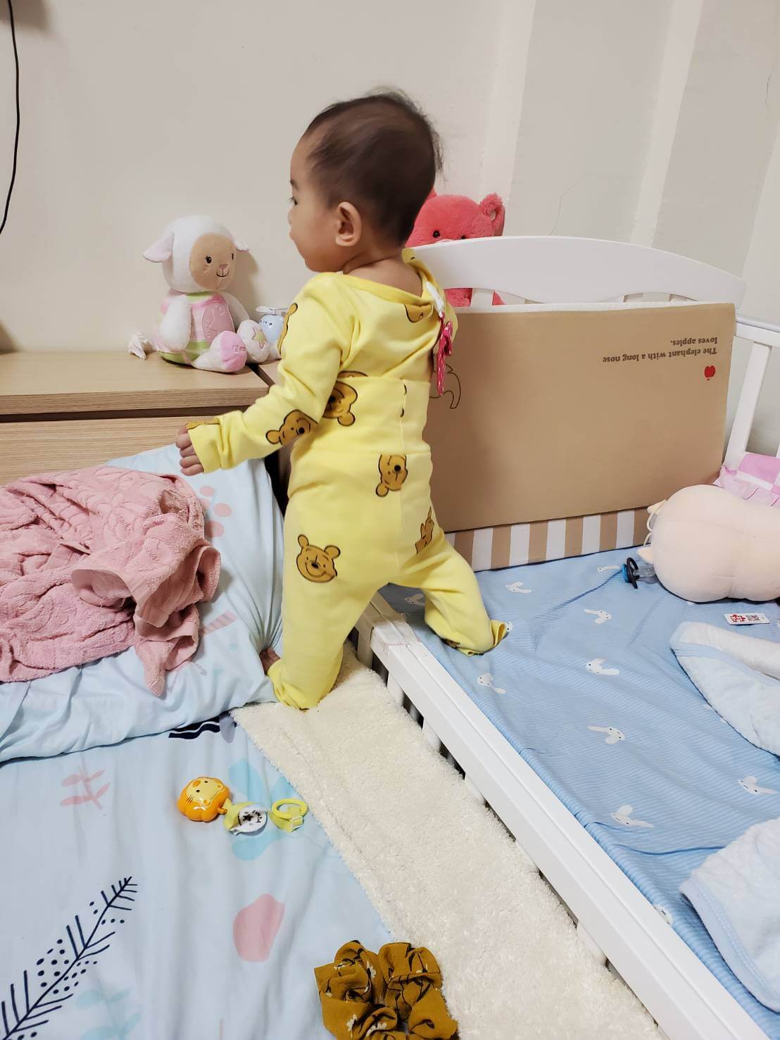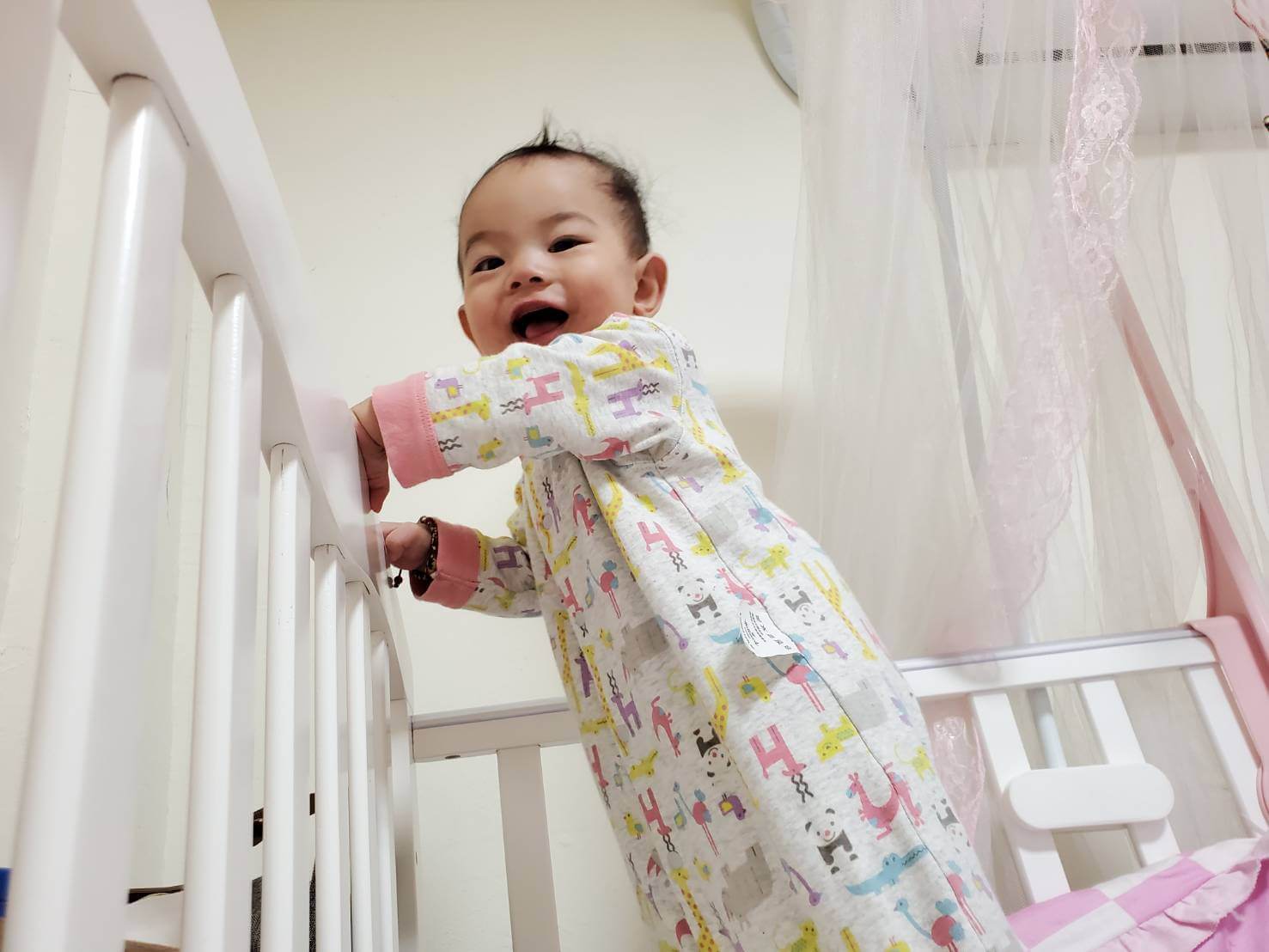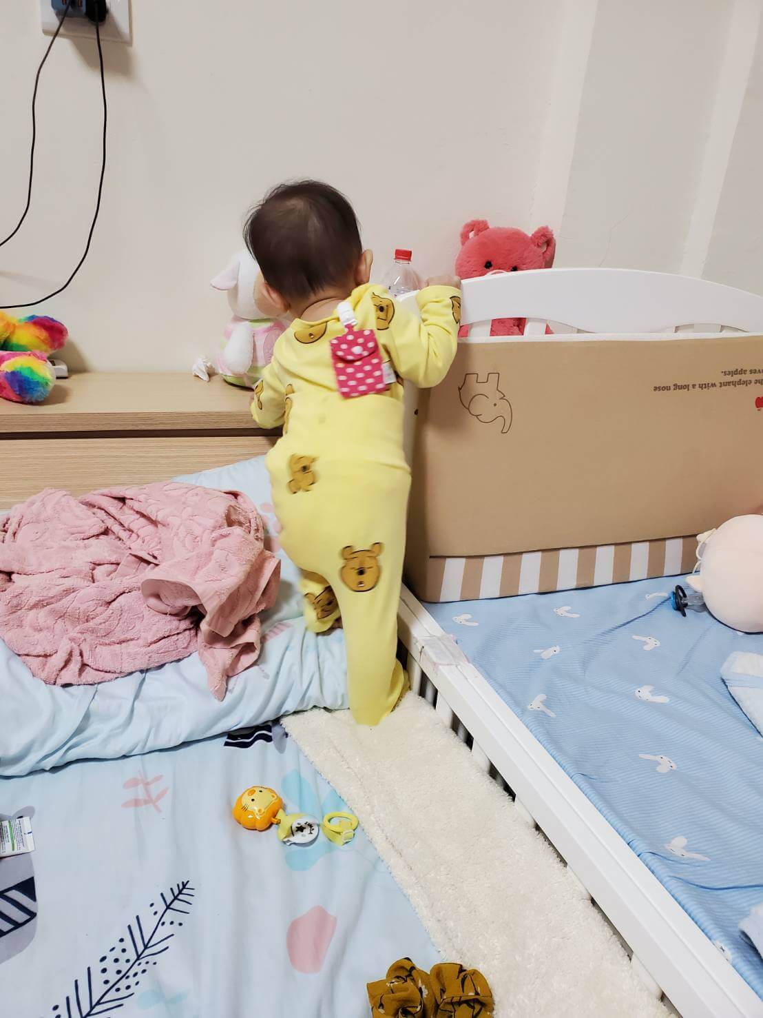 媛媛是一個好奇寶寶,看得到的,她都會想去碰碰看、摸摸看、玩看看,所以常常一覺醒來就扶著嬰兒床的圍欄走來走去拉來拉去,原本掛在床邊的音樂鈴也因為這樣被我拆了下來