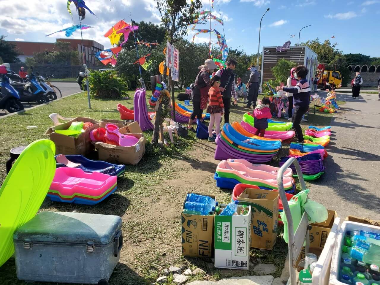 從八里文化公園的入口進來,就可以看到不少攤販在租售滑草板,大小應有盡有,不用擔心沒有器具可以滑草,一旁還有賣風箏的,這邊很空曠又有陣陣涼風,非常適合放風箏呢