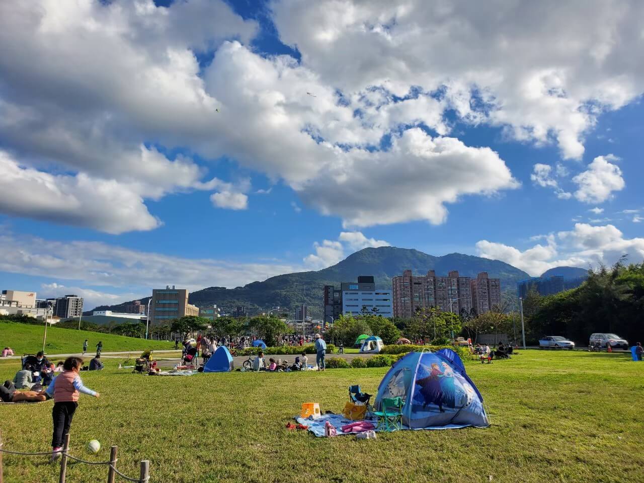 因為八里文化公園的涼亭很少,在大草地上有不少爸爸媽媽很聰明,帶著帳篷或是野餐墊,讓小朋友去盡情的玩耍,而大人們則是直接來個野餐約會,小朋友玩累了也能回來休息