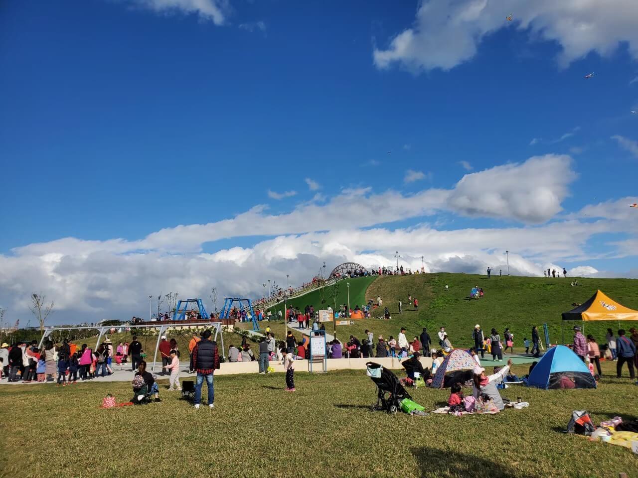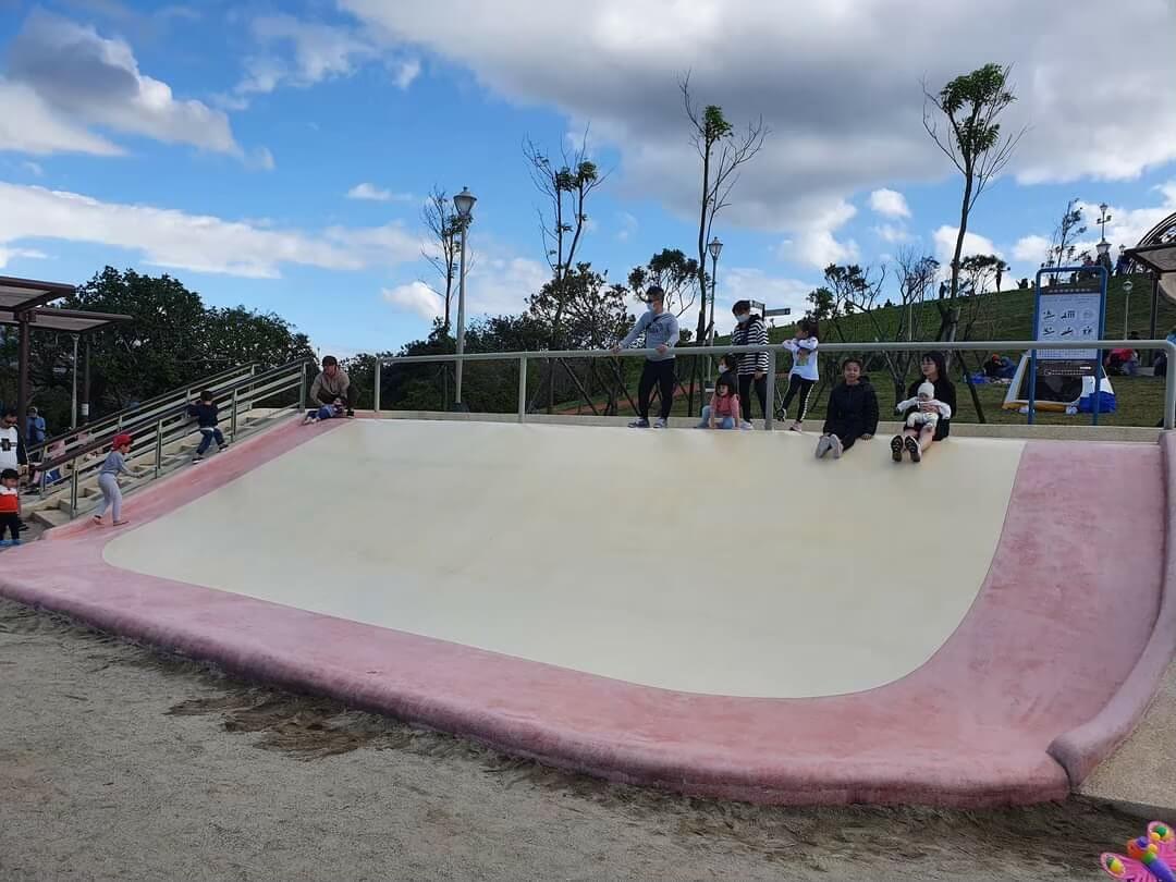 八里文化公園,之前是「米飛園區」,近幾年改造成小朋友的天堂,有超長溜滑梯、共融遊戲場、滑草坡等等,還有超大一片的草地,適合小朋友跑跑跳跳