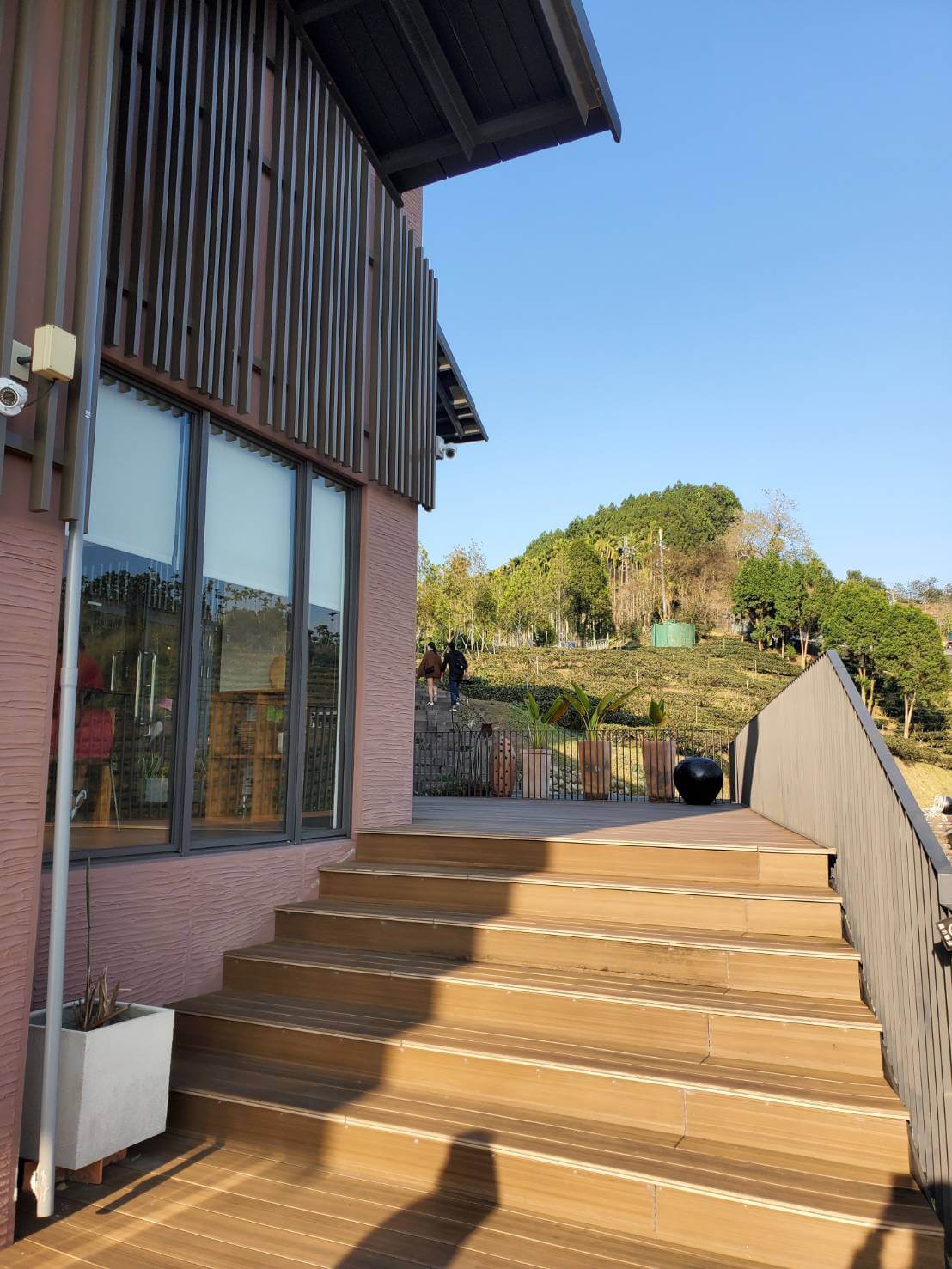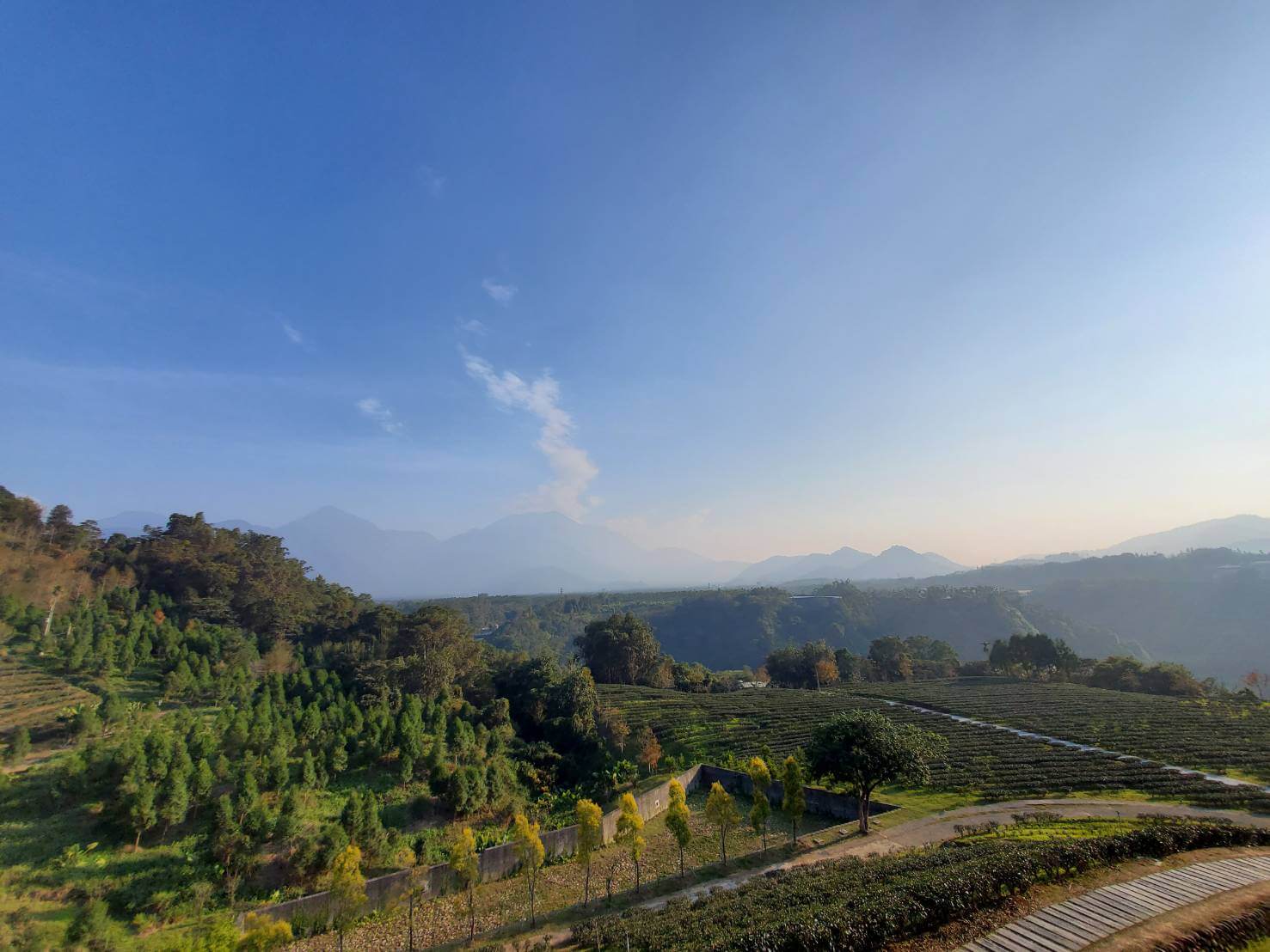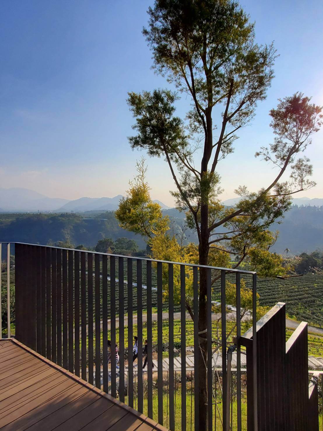 從這個陽台看出去的景色很美,沒有任何遮蔽物一覽無遺,可以看到咖啡廳下方有排列整齊的茶葉田,還有遠方山巒交錯的美景