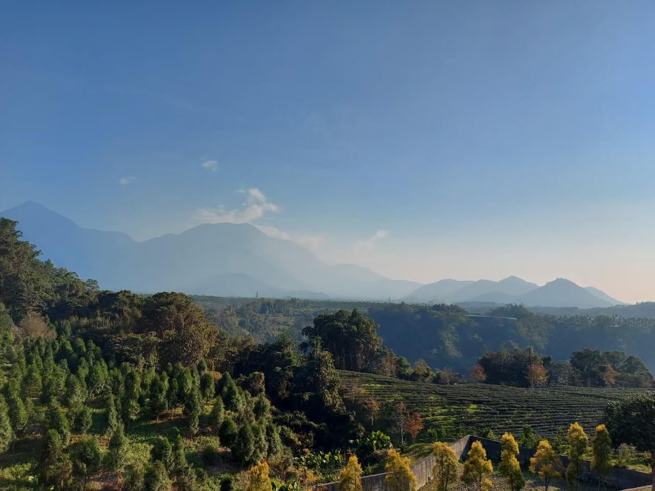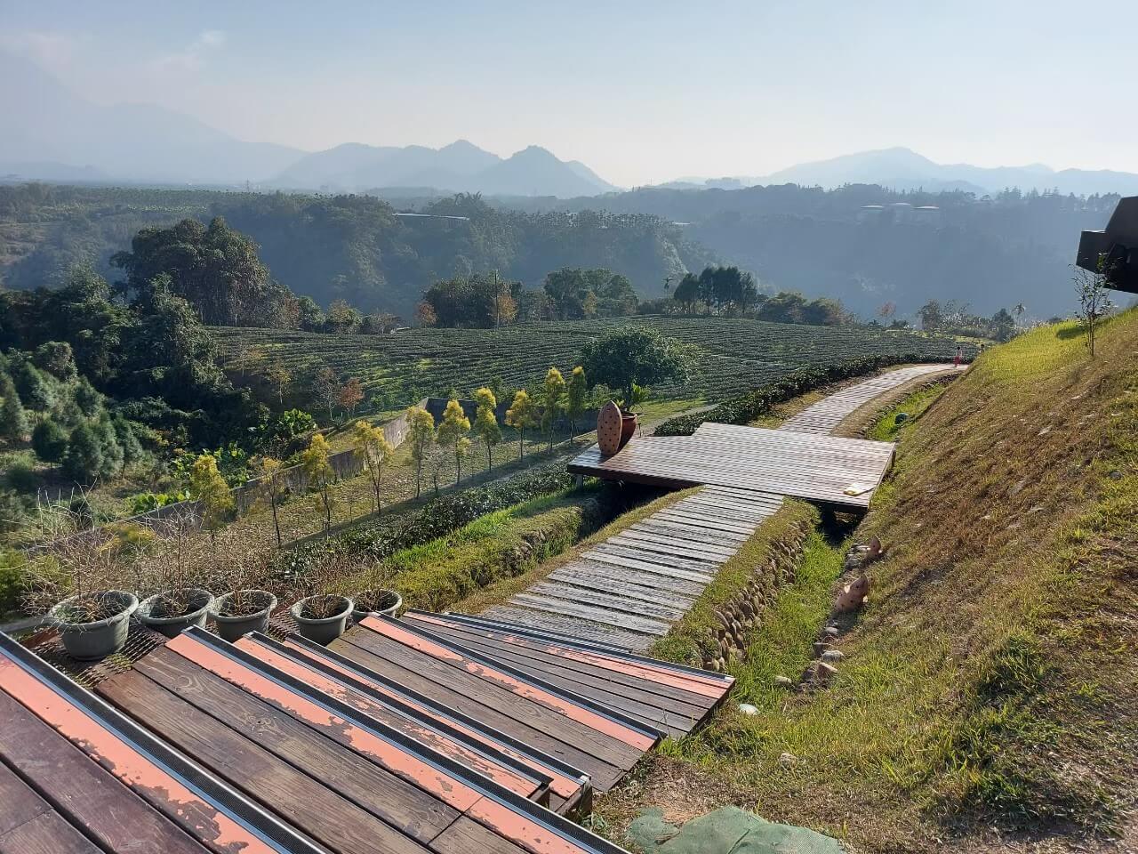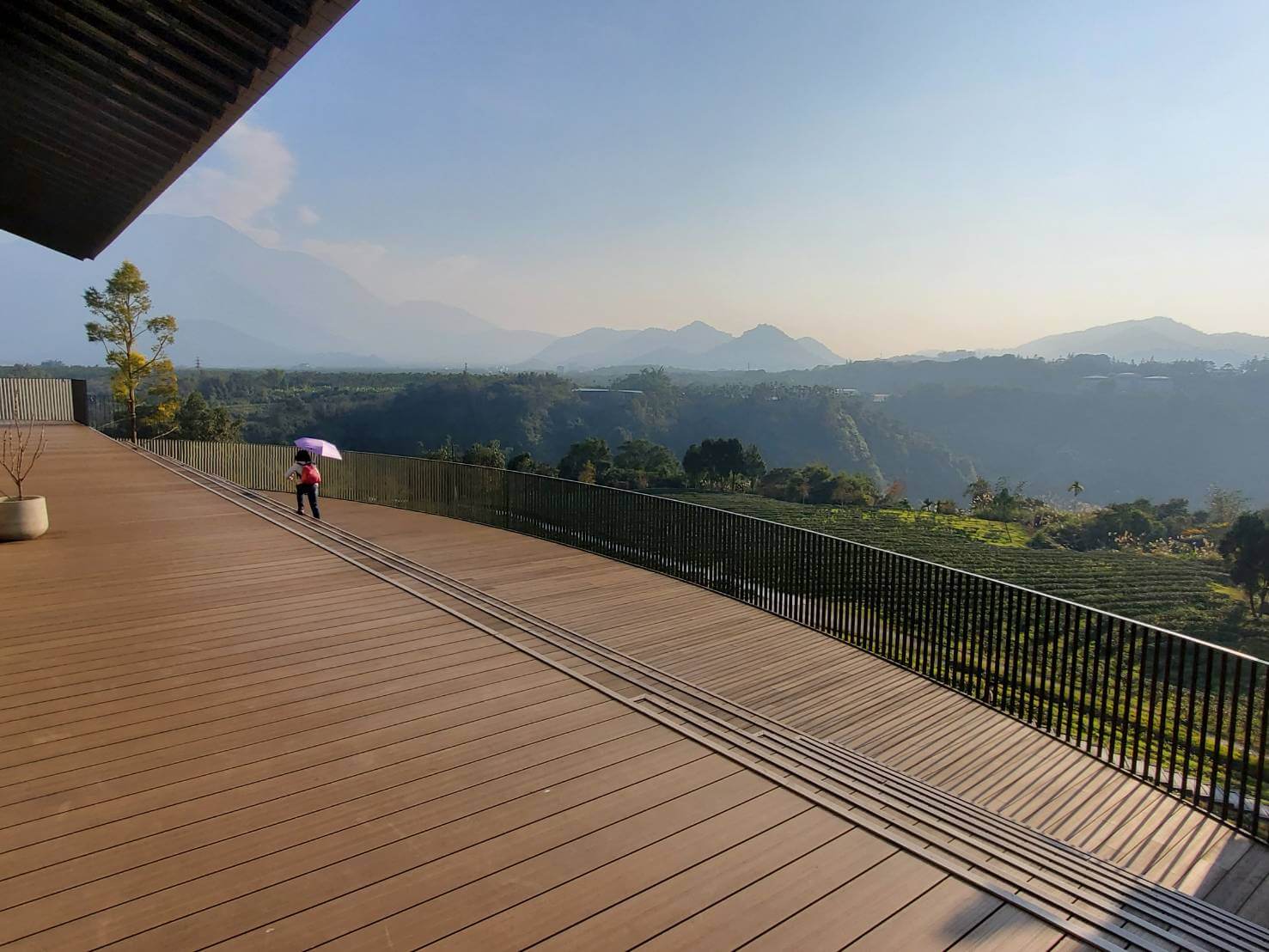 從這個陽台看出去的景色很美,沒有任何遮蔽物一覽無遺,可以看到咖啡廳下方有排列整齊的茶葉田,還有遠方山巒交錯的美景
