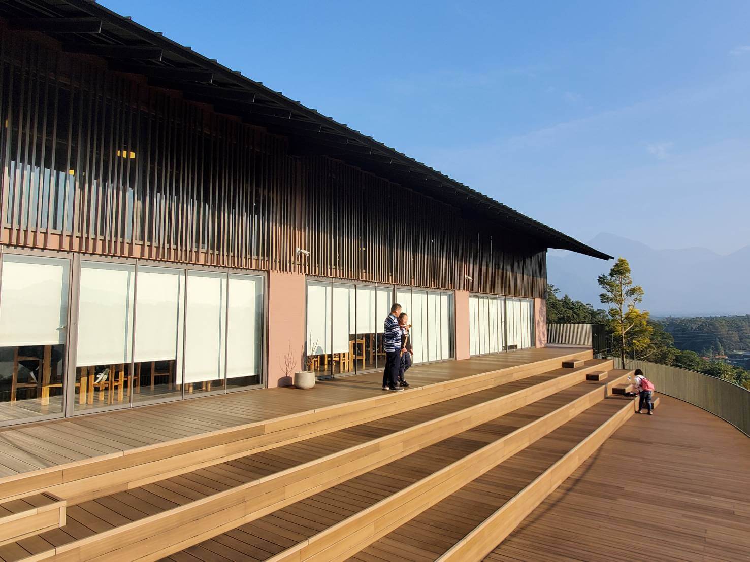 鹿篙咖啡莊園的佔地很大,咖啡廳的建築蠻有現代感設計的,前方是一個很大的半圓形的木製陽台,不少人都在這裡取景拍照