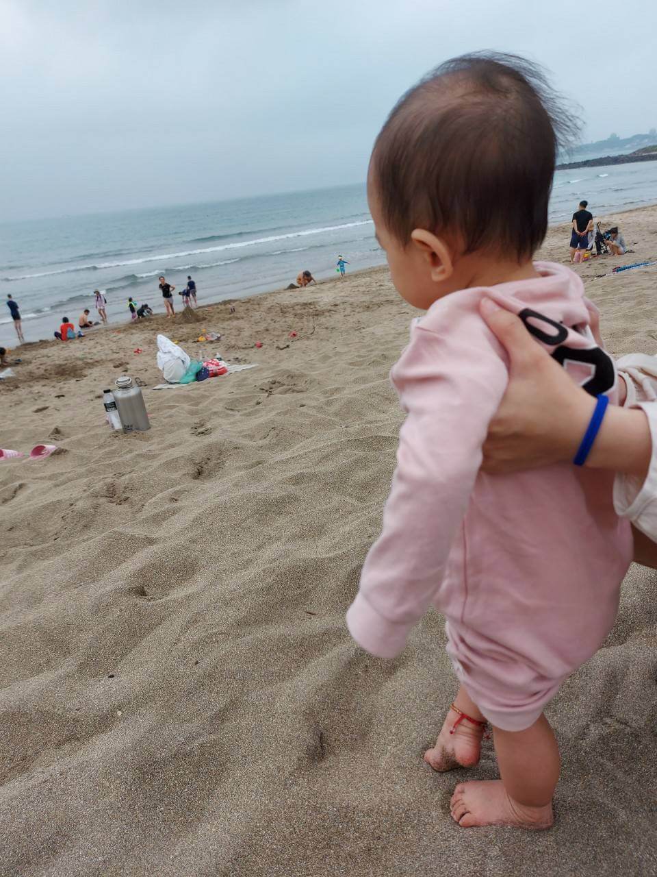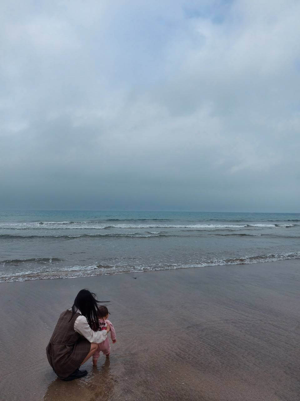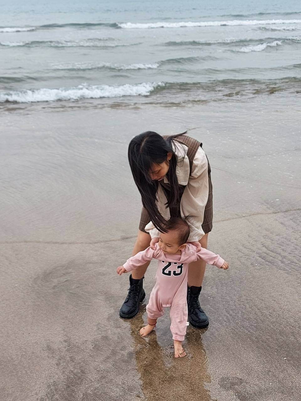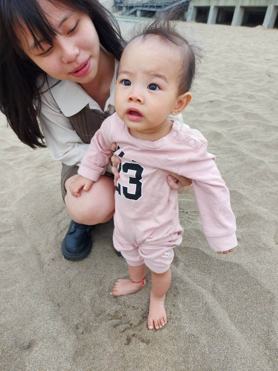 我就這樣帶著媛媛從乾沙灘慢慢的走到了海水到的了的地方,原本也以為媛媛會不喜歡這種感覺,沒想到海浪打了幾次以後,調皮的她竟然還學會了踢水,也太可愛了吧