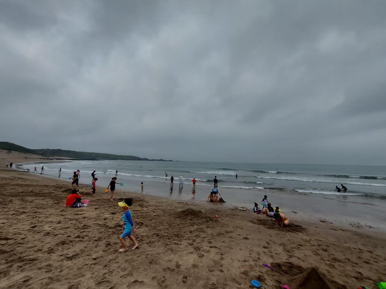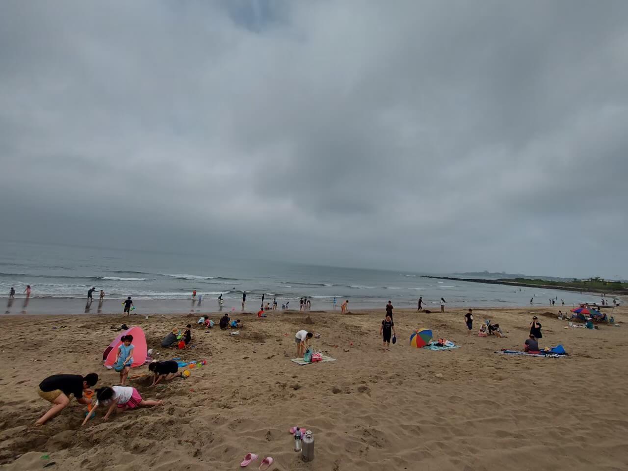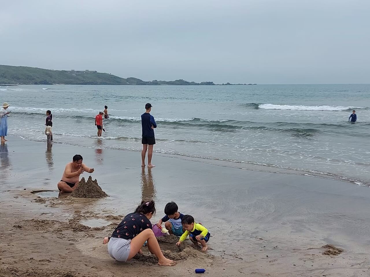 但是天氣不美麗,好像也不影響大家戲水踏浪的心情,這天幾乎都是家庭一起出遊溜小孩,光是沙子,小朋友們就玩的不亦樂乎,而大一點的小朋友則是全身溼答答的在淺灘玩水