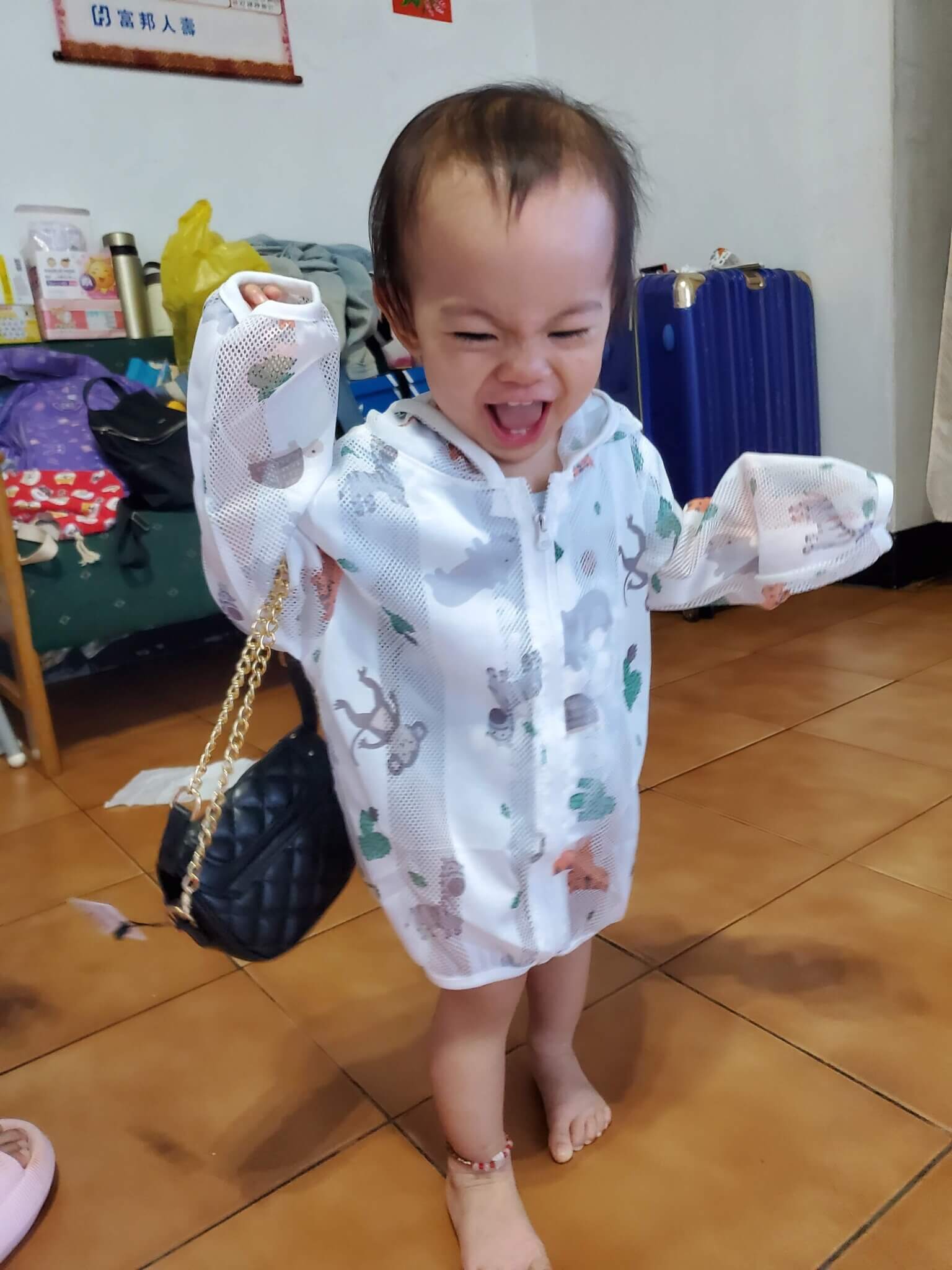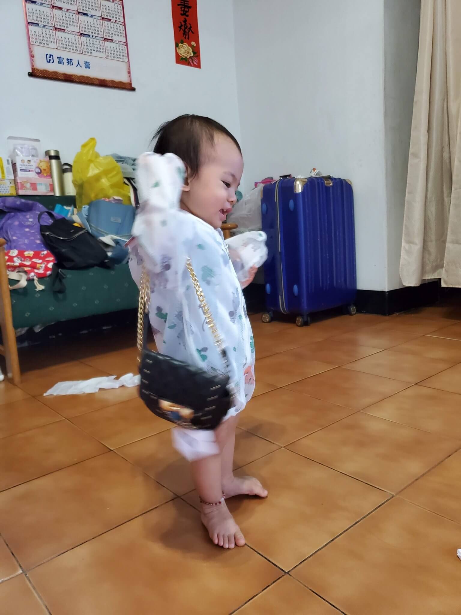 因為包包鏈子太長,姐姐把鏈子調整一下才給媛媛,一拿到自己專屬包包的媛媛高興的不得了,拿著包包在那邊晃啊晃的,有夠可愛