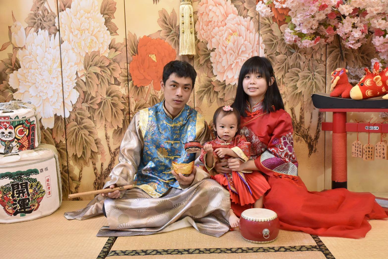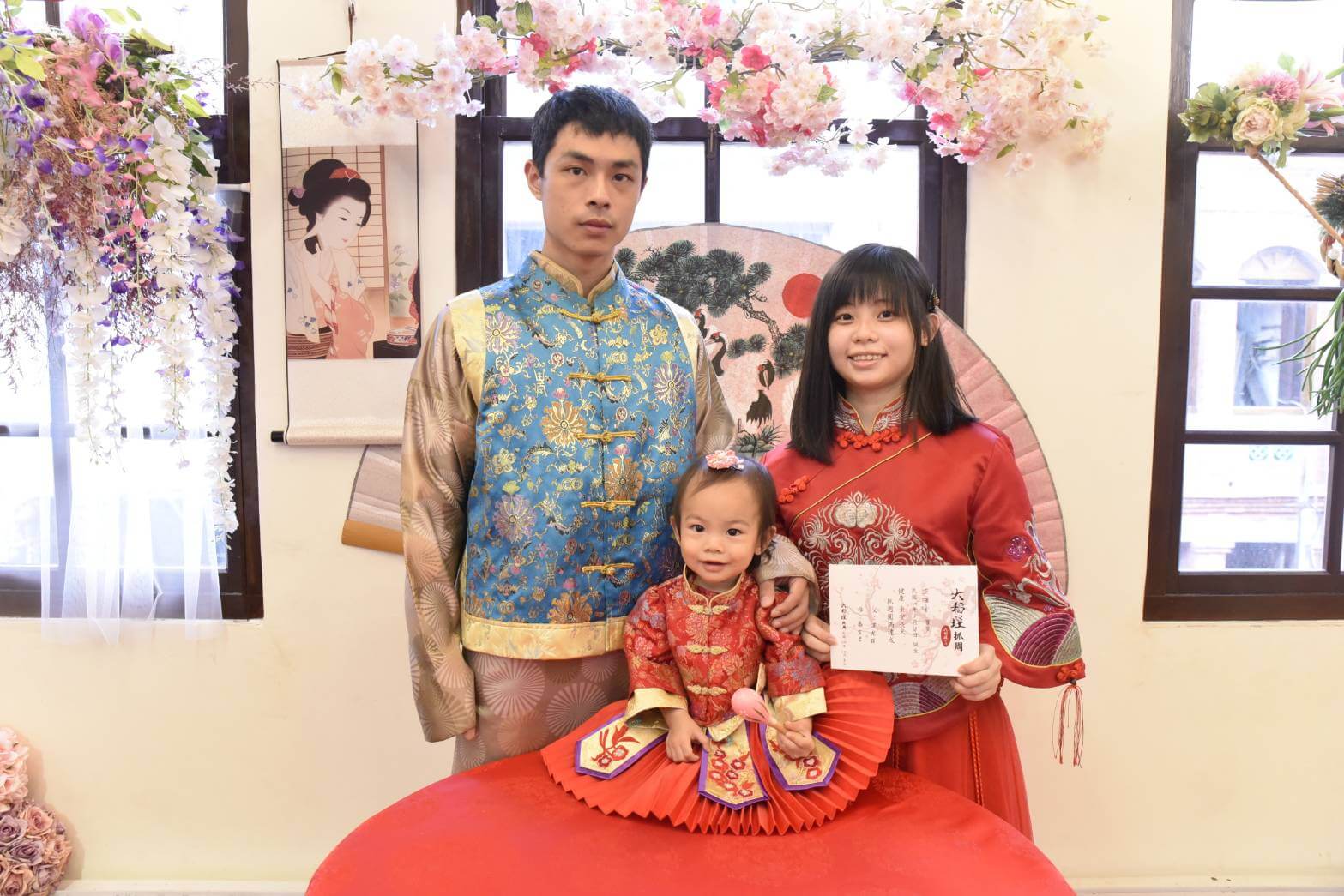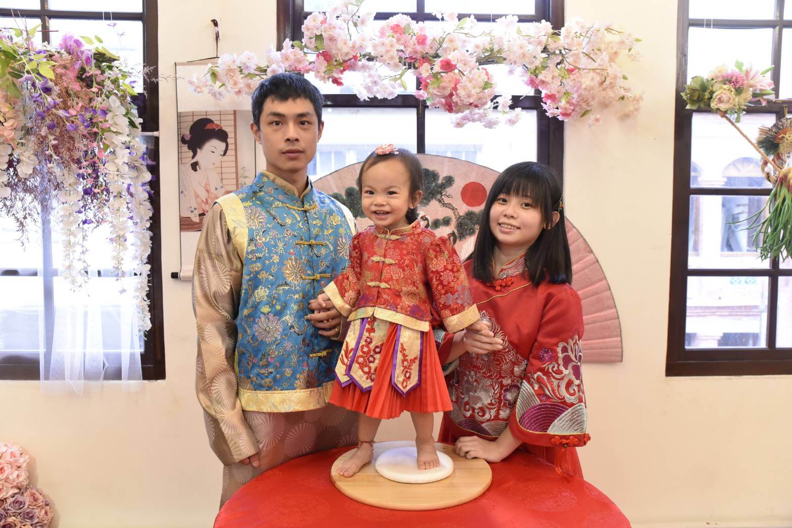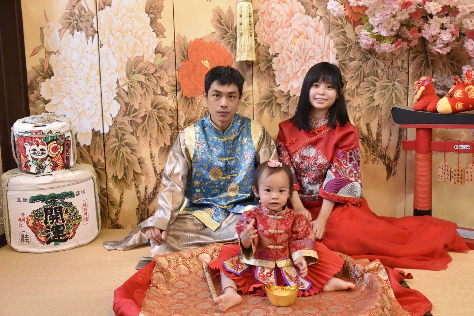 大稻埕抓周可以有提供中日韓三種風格服飾,原本一開始我已經想好要給媛媛穿日式的,結果看到中式的衣服太可愛,立馬變心讓媛媛穿上中式的衣服