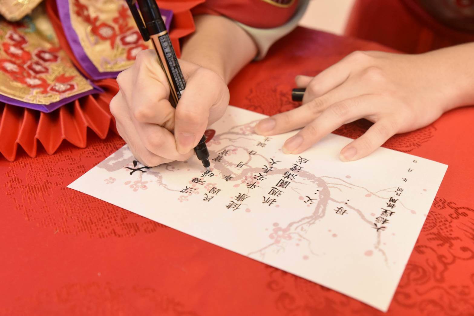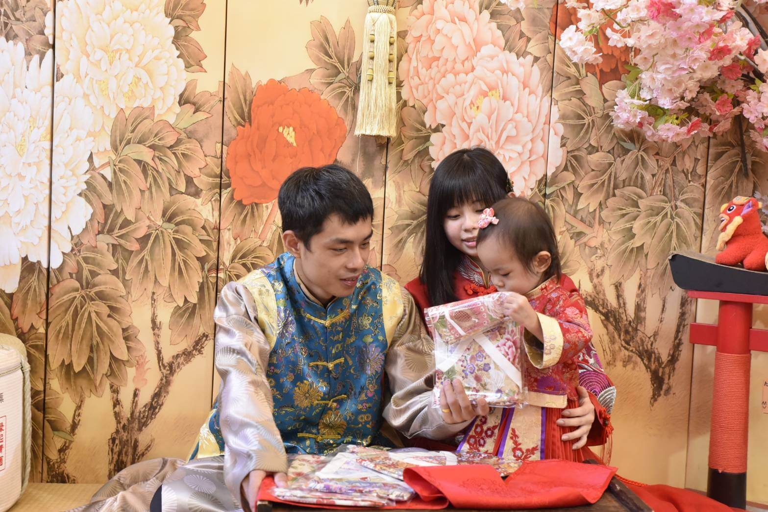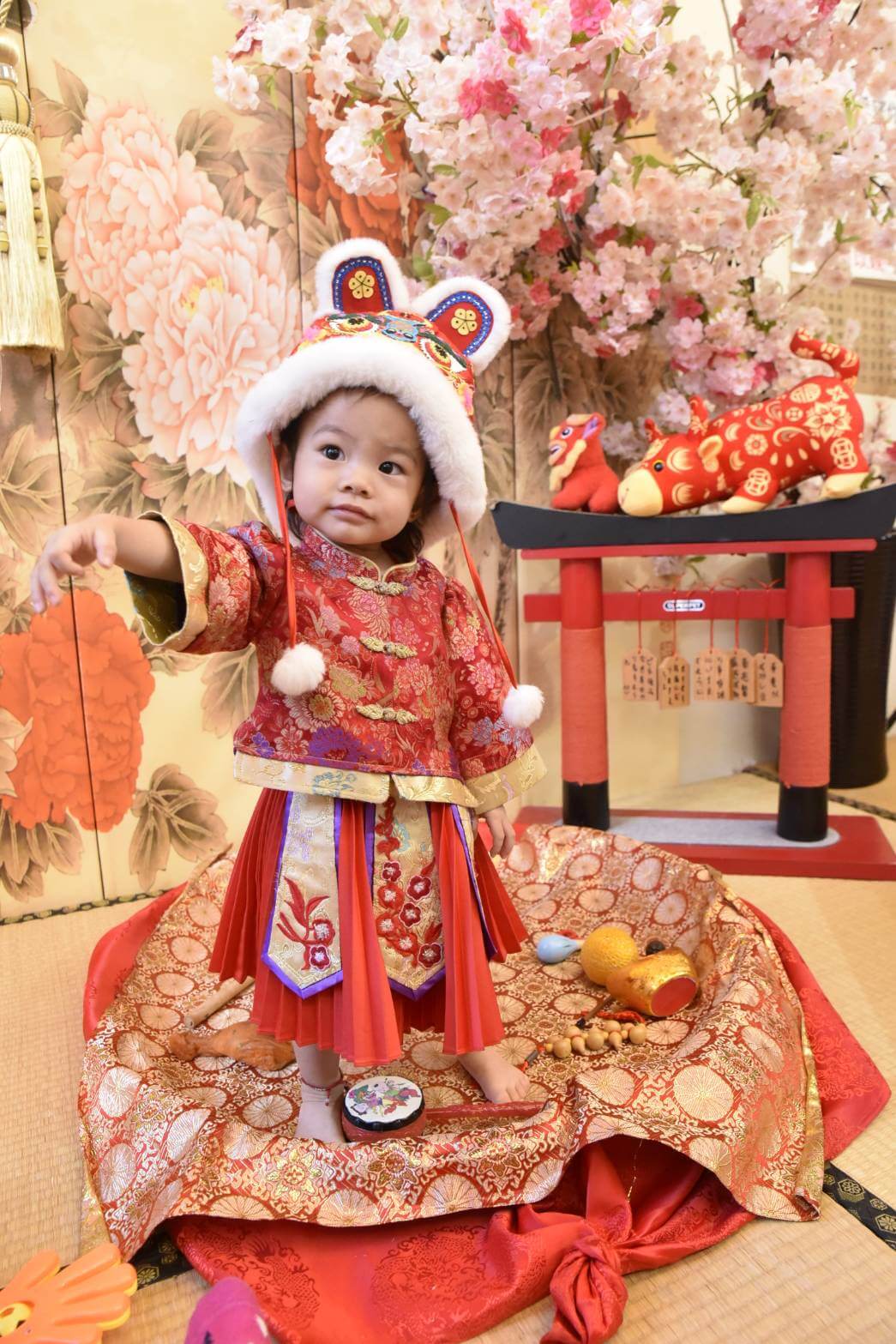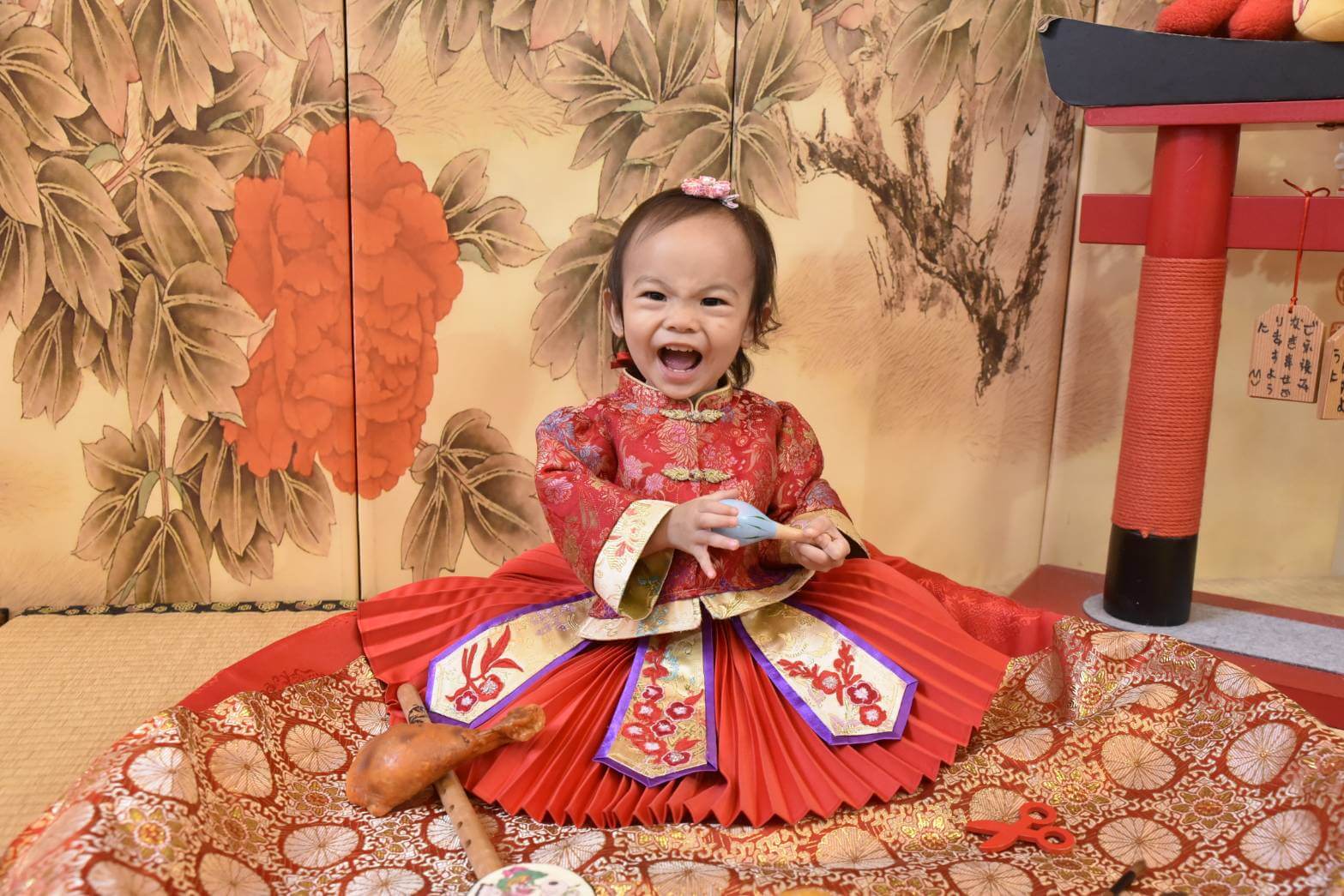 大稻埕抓周可以有提供中日韓三種風格服飾,原本一開始我已經想好要給媛媛穿日式的,結果看到中式的衣服太可愛,立馬變心讓媛媛穿上中式的衣服