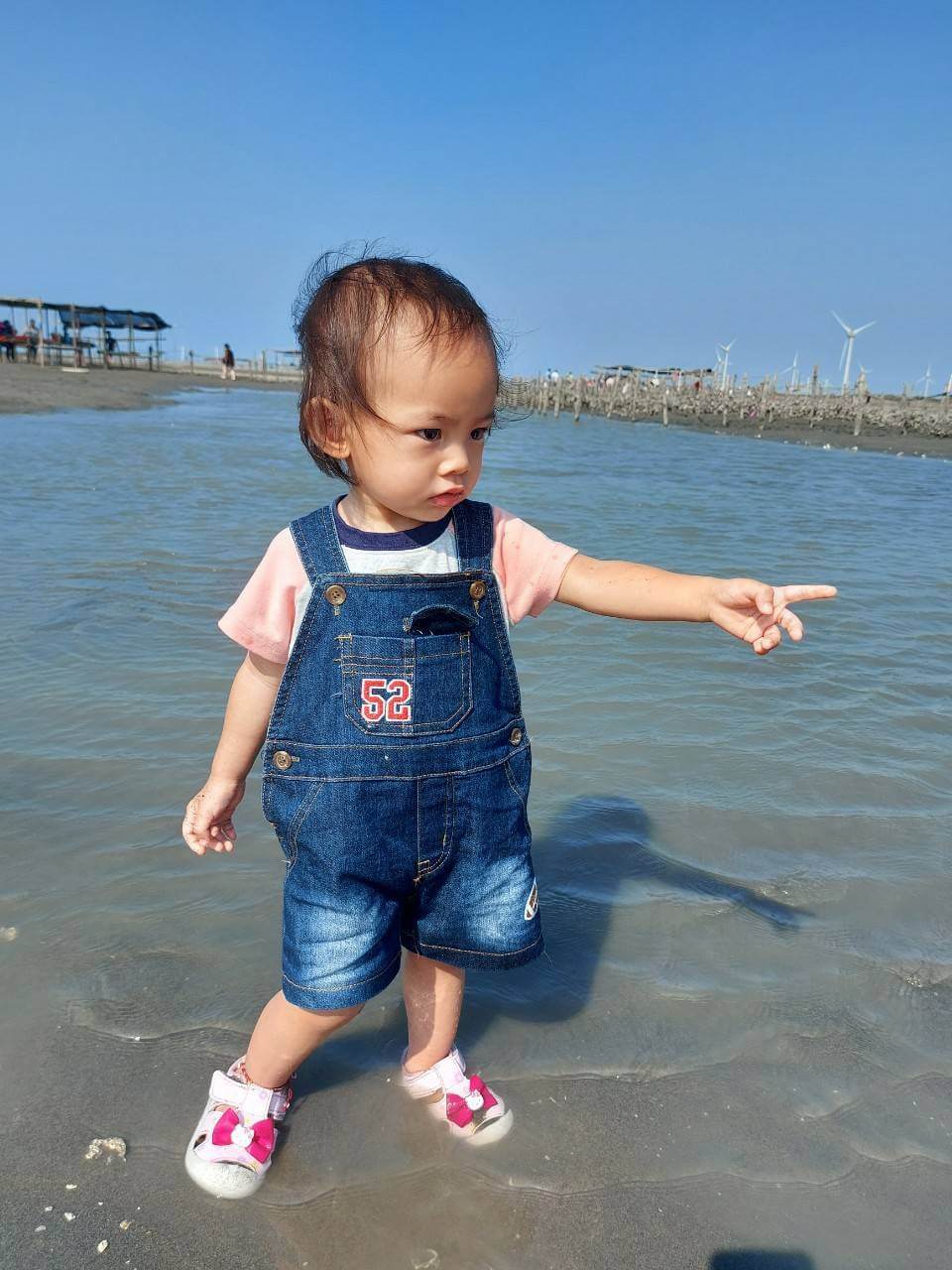 我們到了挖文蛤的地方,把媛媛放下來想讓她自己走,一開始她走的很開心,不知道後來是因為進沙了還是累了,一直站在原地不敢動,就連水坑她也不敢走,我們也只好抱抱走走的讓媛媛去探索