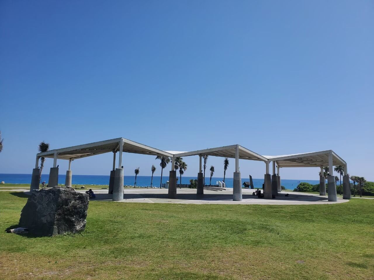 從停車場要過去七星潭海邊的中間,有一塊廣場,當天滿多家長帶著小朋友在這邊跑、騎腳踏車放放電,中間還有設置遮陽的,玩累了就可以坐在下面躲太陽乘涼