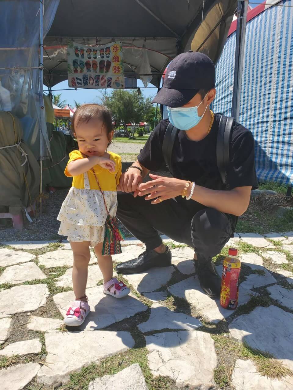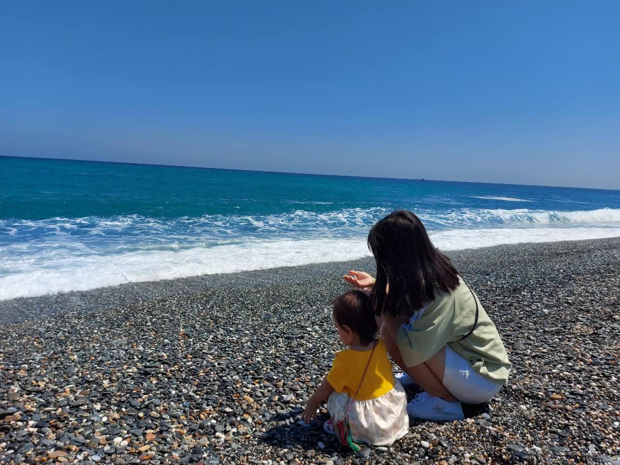 疊完石頭塔後,我們終於來到了海岸邊,這裡的浪花有點大,不過一旁有年輕人在踏浪戲水,而媛媛也一直比著想往前去踩水,可是當天的浪花會沖的媛媛站不穩,我只帶她到最近的地方去看和撿石頭