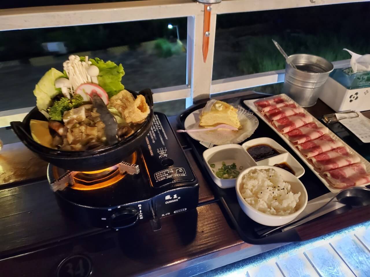 星星複合式夜景餐廳的上菜速度很快,大概入座10分鐘就開始陸陸續續上菜了,我們這天點了雪花牛火鍋套餐和梅花豬單人碳烤套餐,還另外加點了炸生蠔和草莓千層