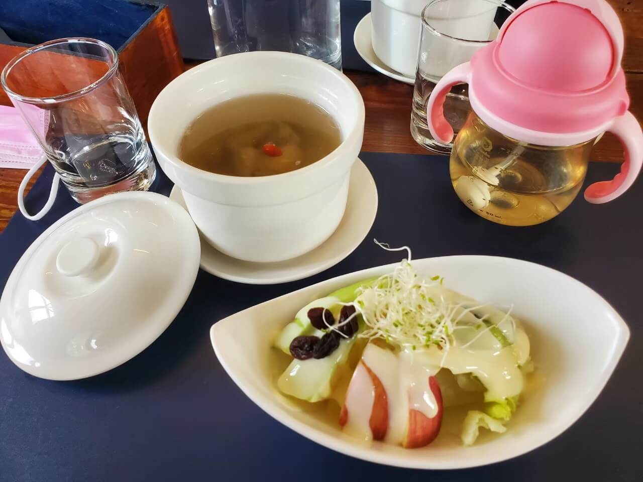 可妮小屋的餐點是套餐式的,上餐速度蠻快的,點完餐沒多久,就先送上湯品和水果沙拉,每一天的湯品好像都不一樣,我們當天是喝到排骨湯,順口不油膩