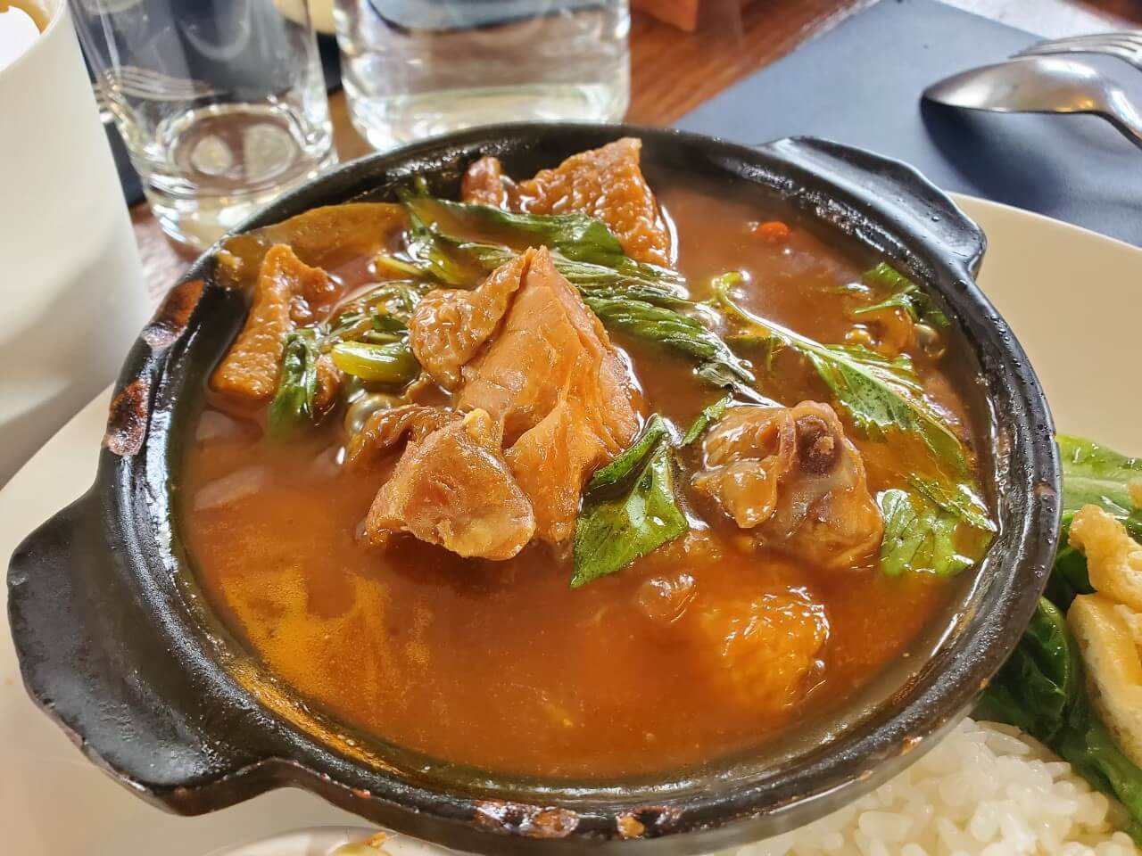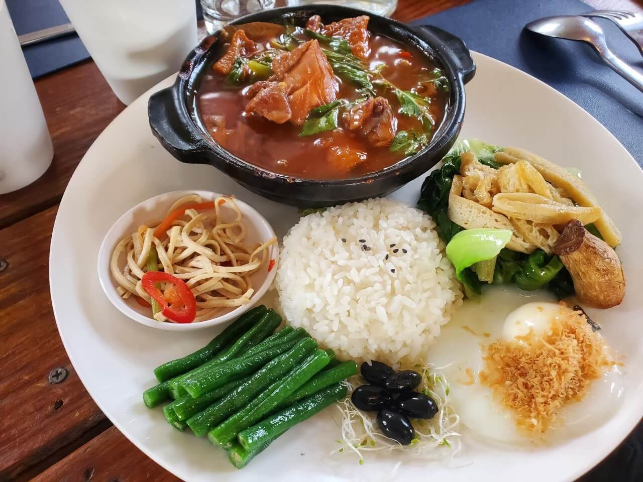小伙伴這一天點了紹興雞套餐,我則是點了雞腿排套餐,主餐份量蠻多的,每一份都有五種配菜,黑豆甜甜的,豆干絲很香很下飯,荷包蛋比半熟再熟一點,光是配菜我就覺得很不錯