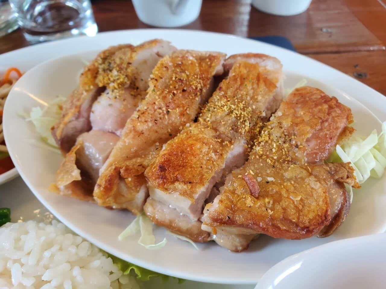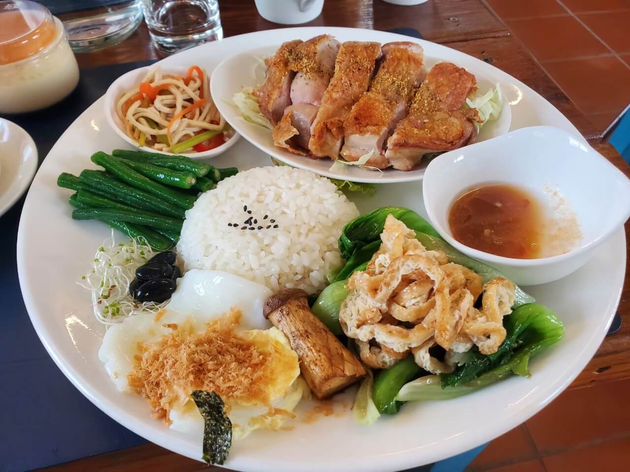 紹興雞因為含有酒所以我沒有吃,不過小伙伴兩三下就把它吃光光,那應該是很不錯的,而雞腿排外皮酥脆肉也不柴,一旁還有椒麻醬可以搭配
