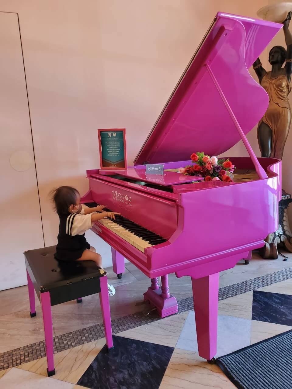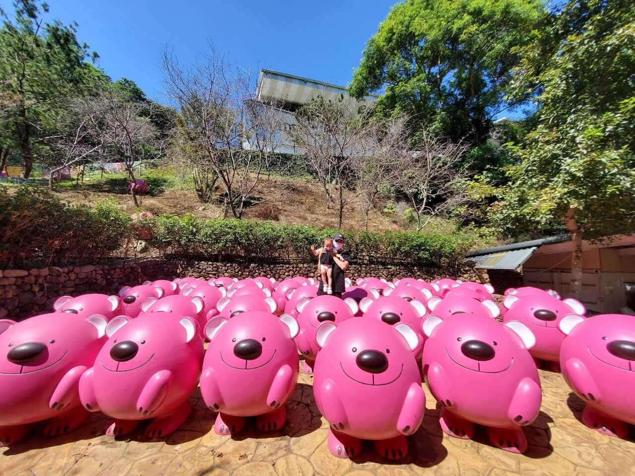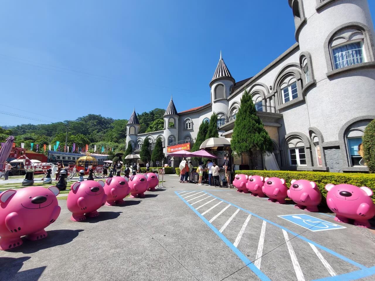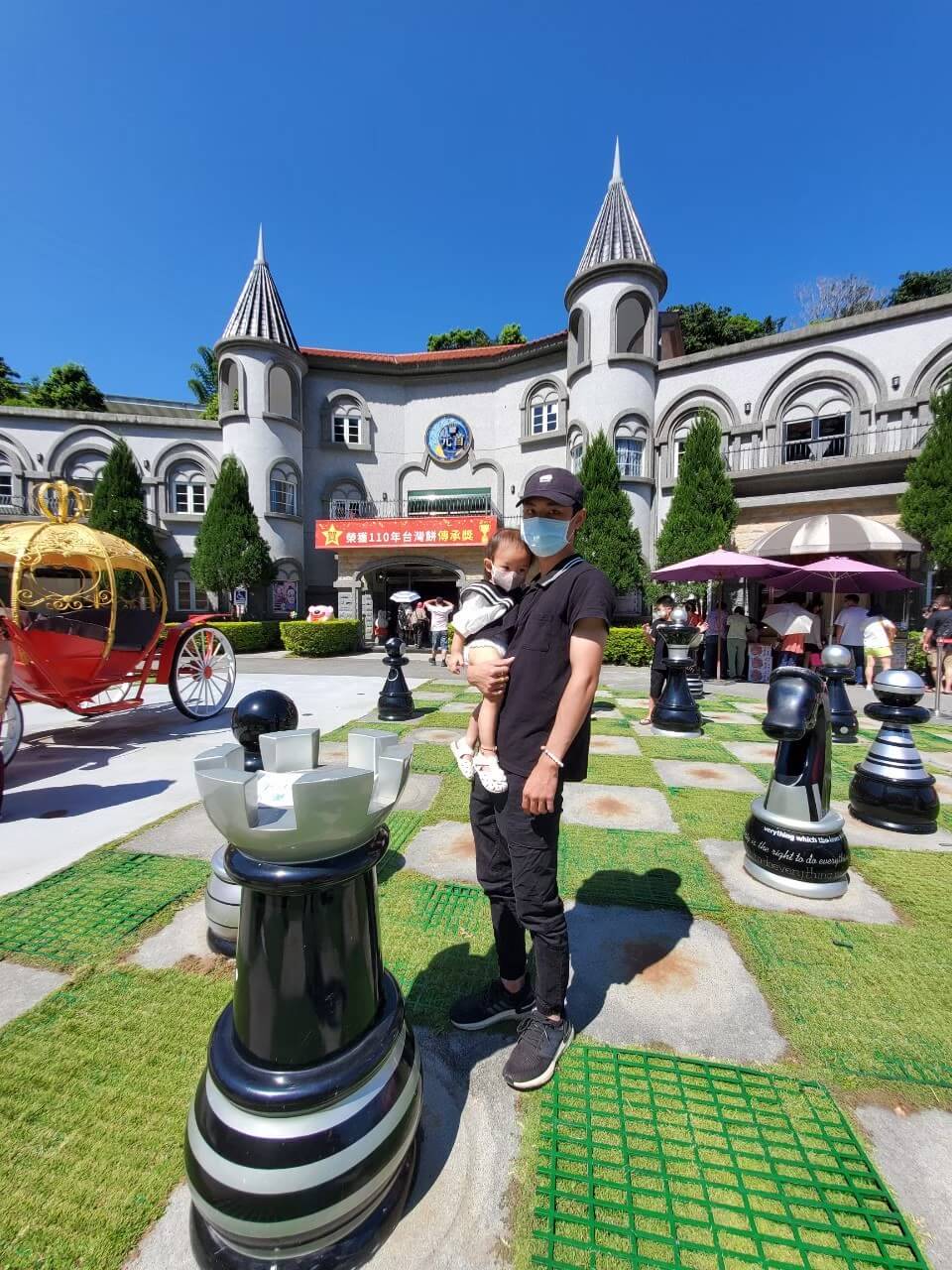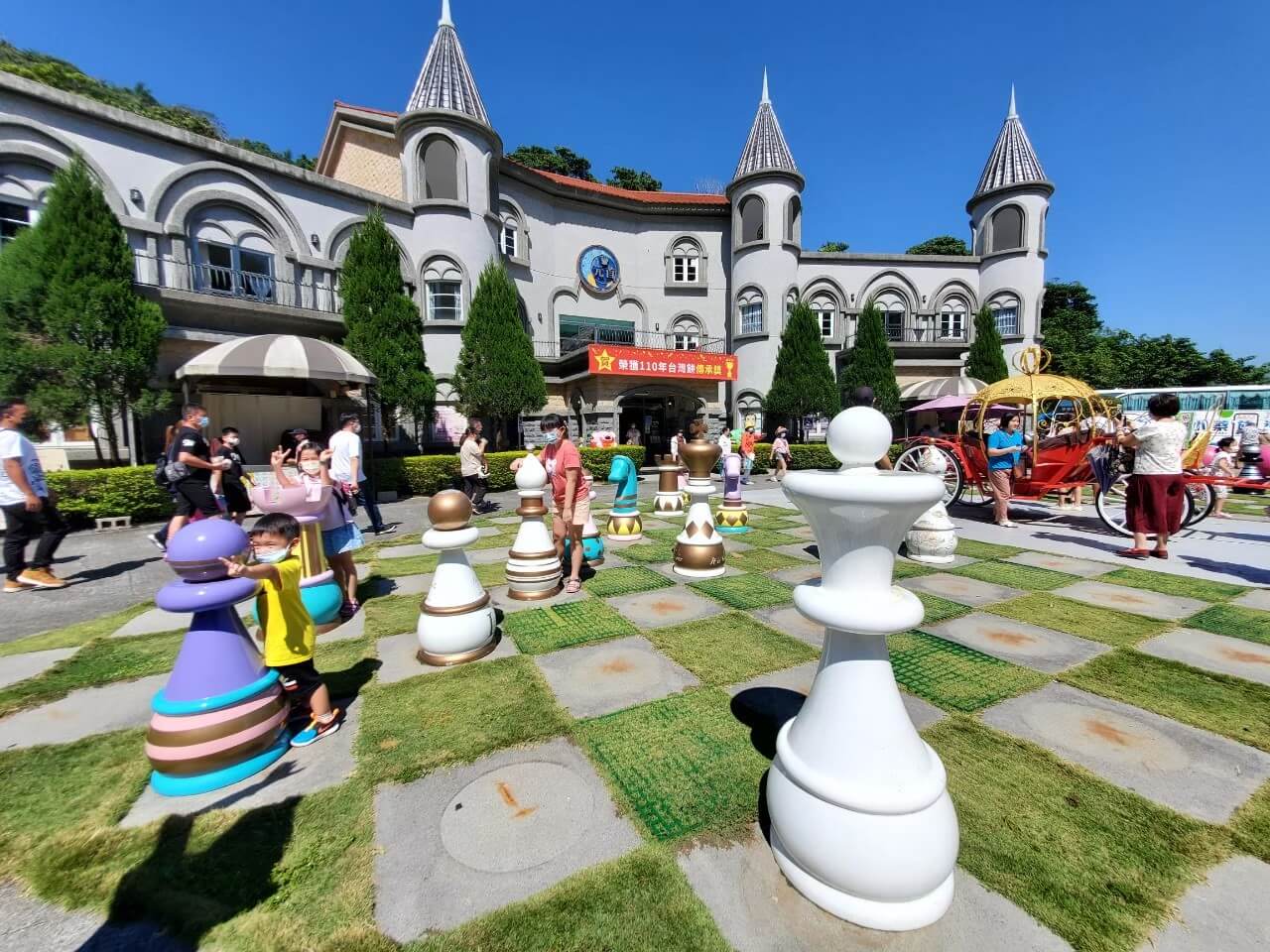 來到元首館主建築的地方,可以看到建築物前面有超大的西洋棋盤,原本小小可以拿在手上的西洋棋,瞬間變成和我們一樣高,超級吸睛又好拍,一旁還有粉色小熊列隊歡迎