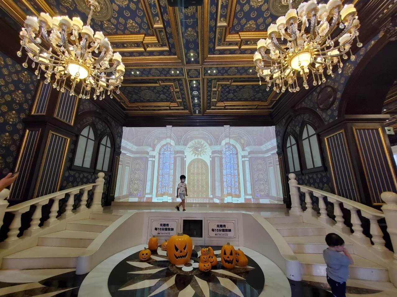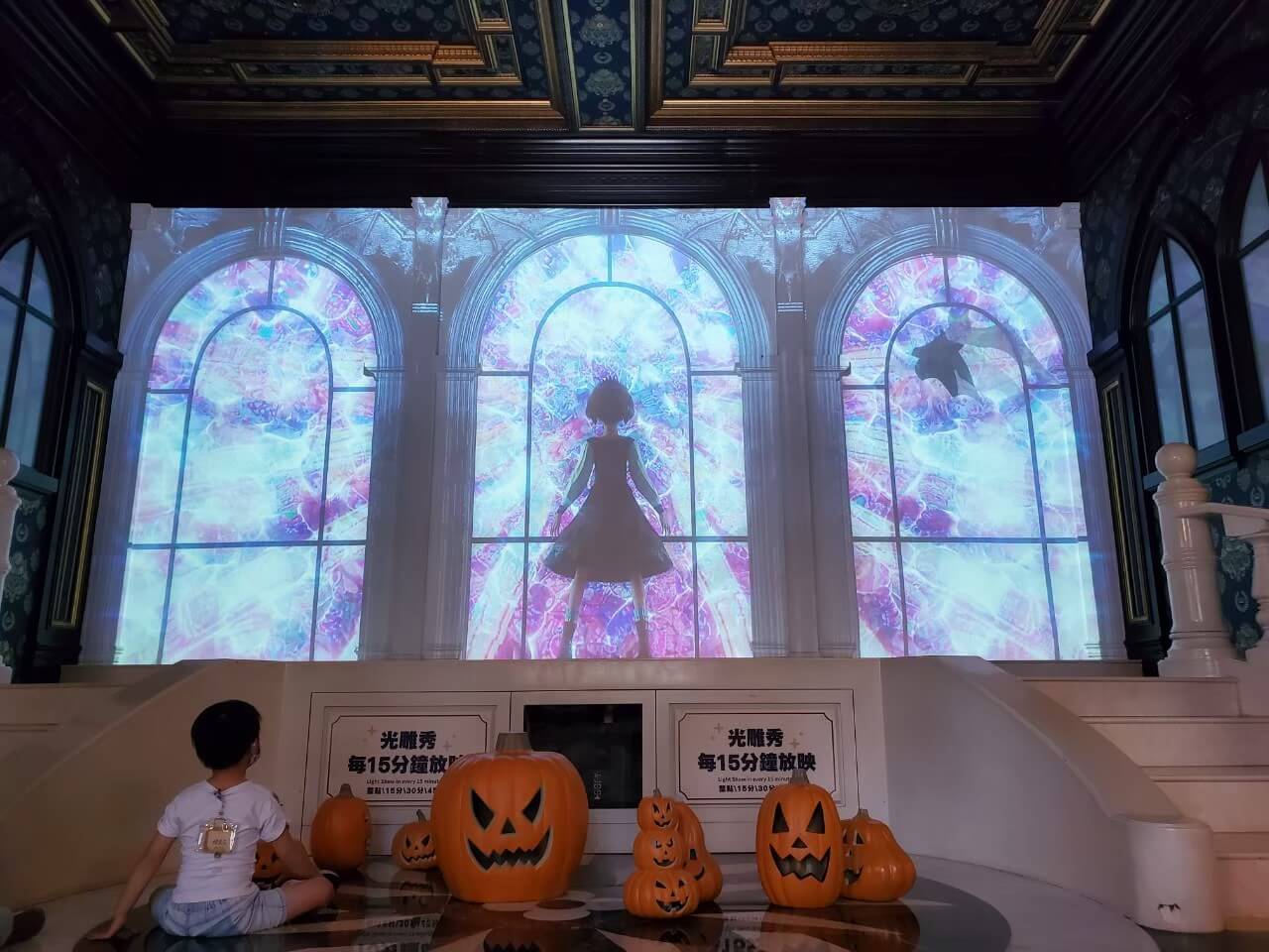 一進去就可以看到一大片的投影幕,這裡每15分鐘就會播放一次光雕秀,在光雕秀還沒播放的時候,這一個小舞台也是大家熱門的取景背景,而且我們到訪時剛好適逢萬聖節,前面還放了好幾顆小南瓜可以讓大家拍照
