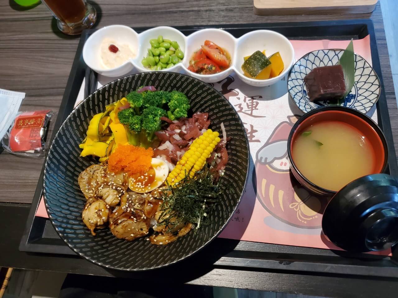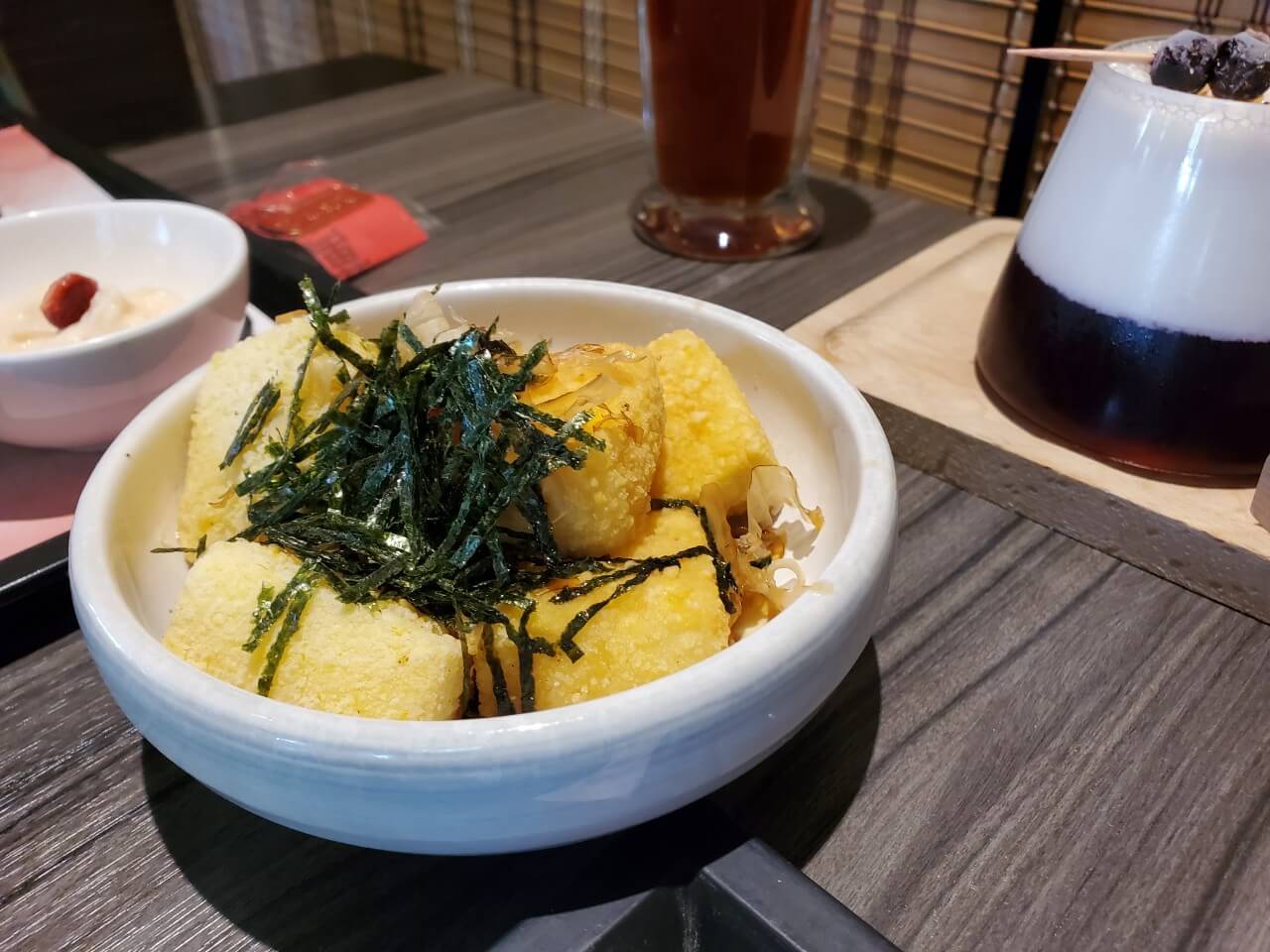 我和小伙伴各點了一份丼飯和定食,我還多點了一份揚出豆腐和莓果奶霜,送上來的份量有點嚇到我,我自認是食量蠻大的女生,當天吃完餐點豆腐還吃不完,如果沒有十足的把握還是不要加點
