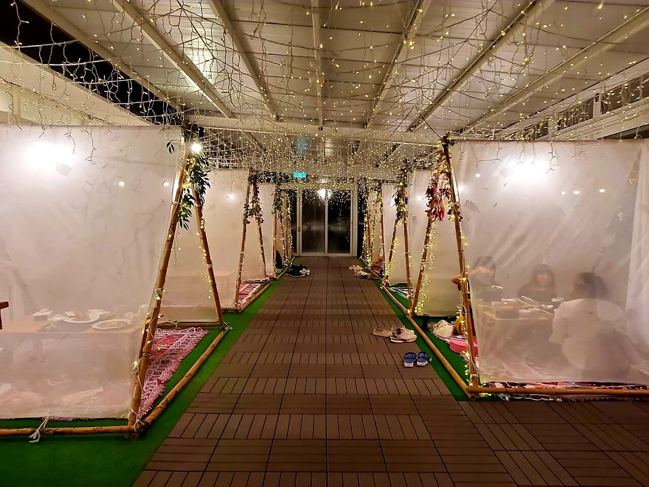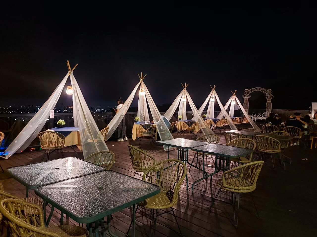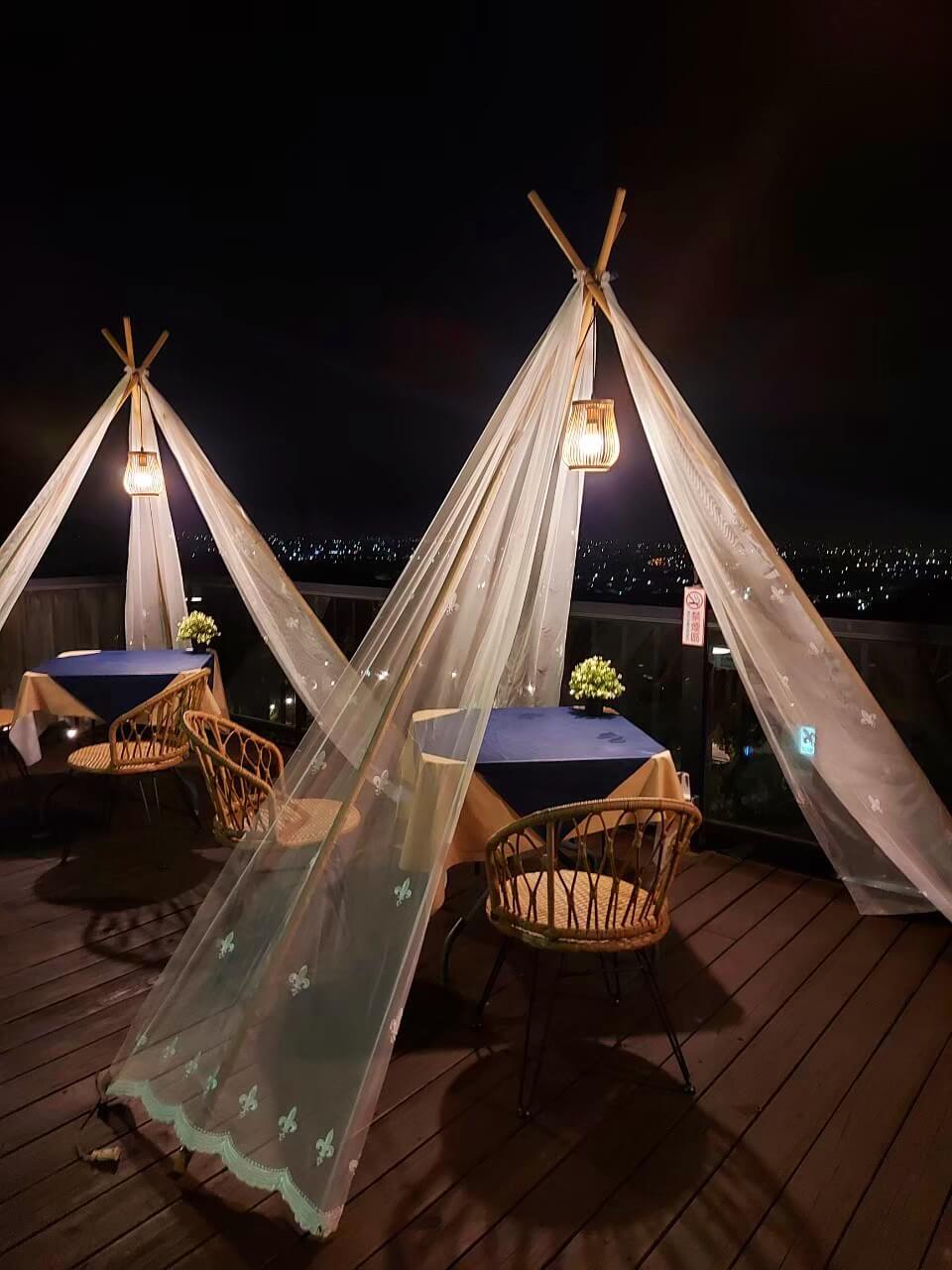 如果是一群人來用餐想坐戶外座位區,這裡也有四人座、六人座的位置,只差在沒有帳篷和看不到夜景而已