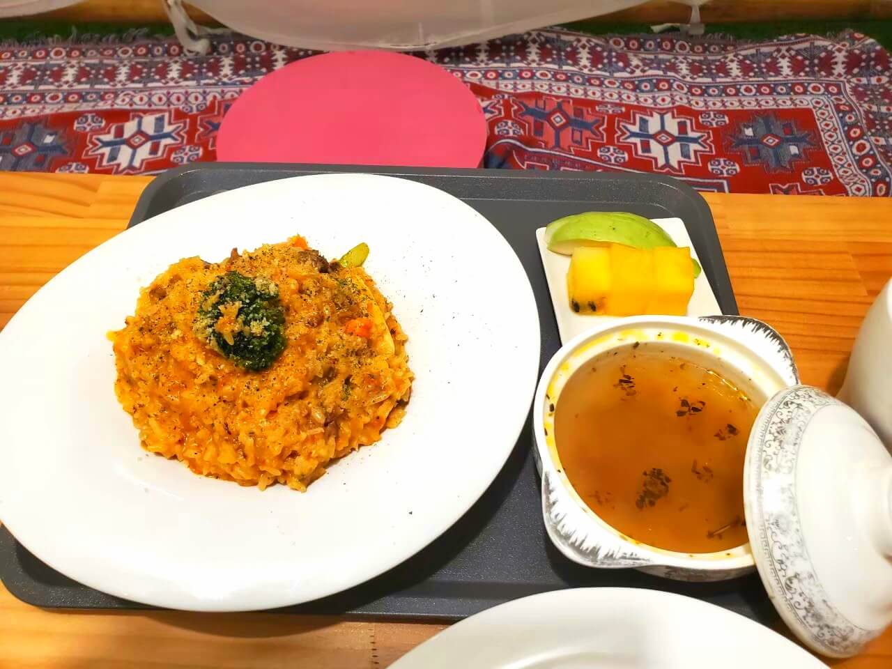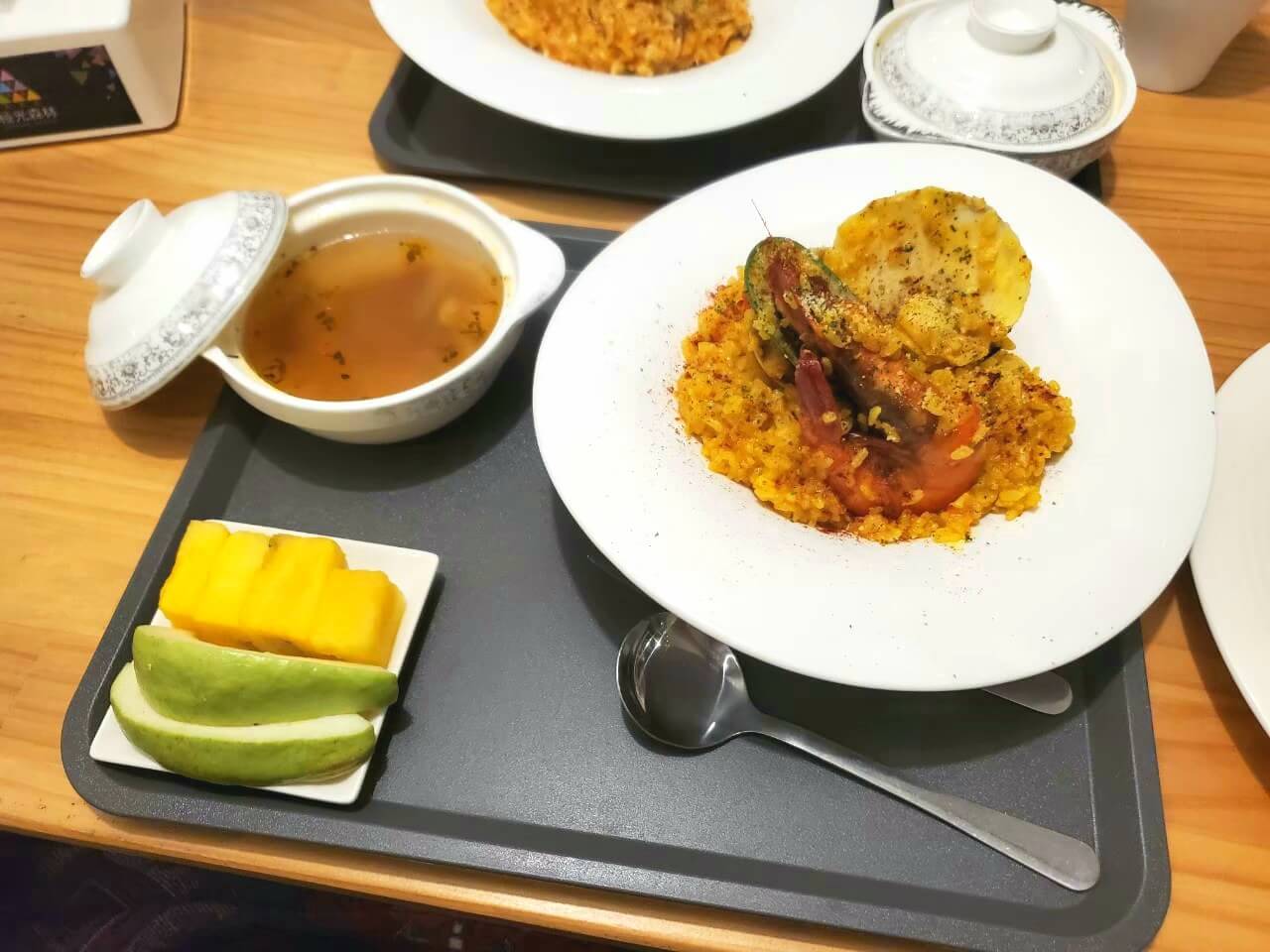 我們這天點了西班牙海鮮燉飯和紅酒牛肉燉飯,再額外單點了一份披薩,當天附上的水果是西瓜和芭樂