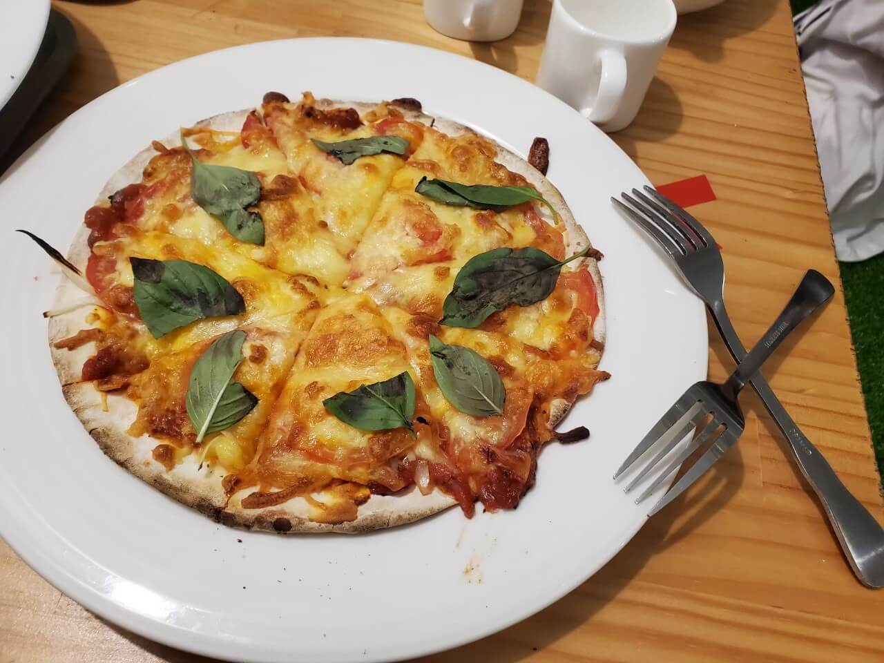 燉飯口感偏軟,喜歡吃米心硬的可能會不太喜歡,我覺得料給的蠻足的,而披薩餅皮則是薄餅的,吃起來口感比較酥脆