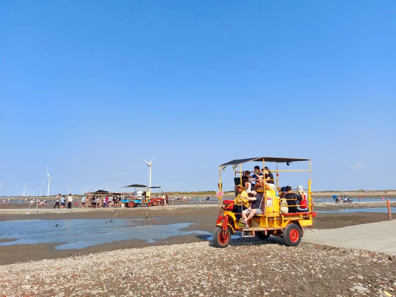 因為彰化景點王功漁港挖蛤的地方位在海邊,所以要前往蚵田都是一律搭乘「鐵牛車」,看到這個鐵牛車就會想到比較有年紀的電影裡,都會出現類似的車輛