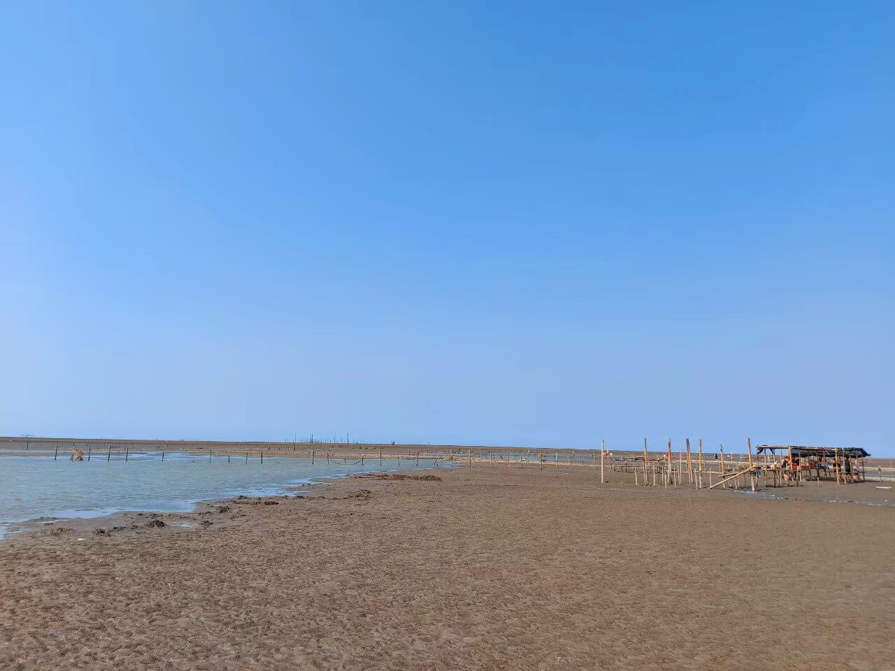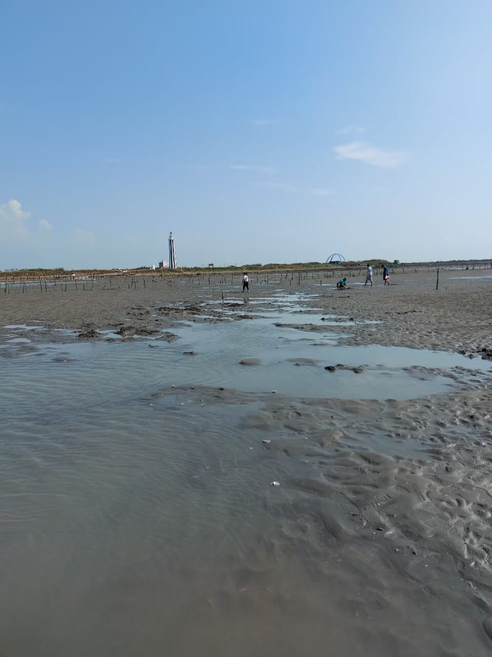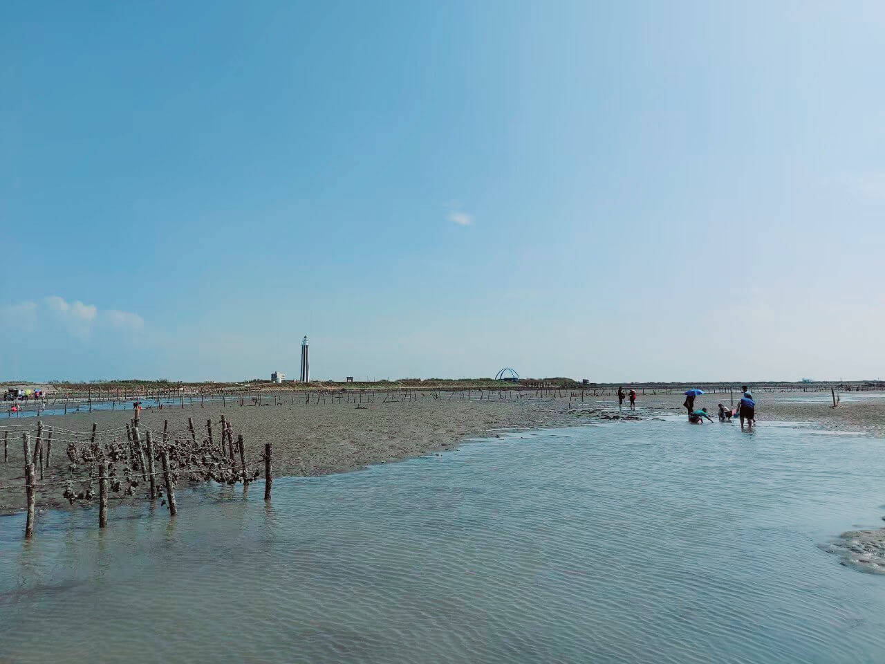搭乘鐵牛車搖搖晃晃大約5分鐘就來到了蚵田,一眼望去全是沙子和水坑,我和小伙伴兩個人穿著布鞋只能小心的慢慢走