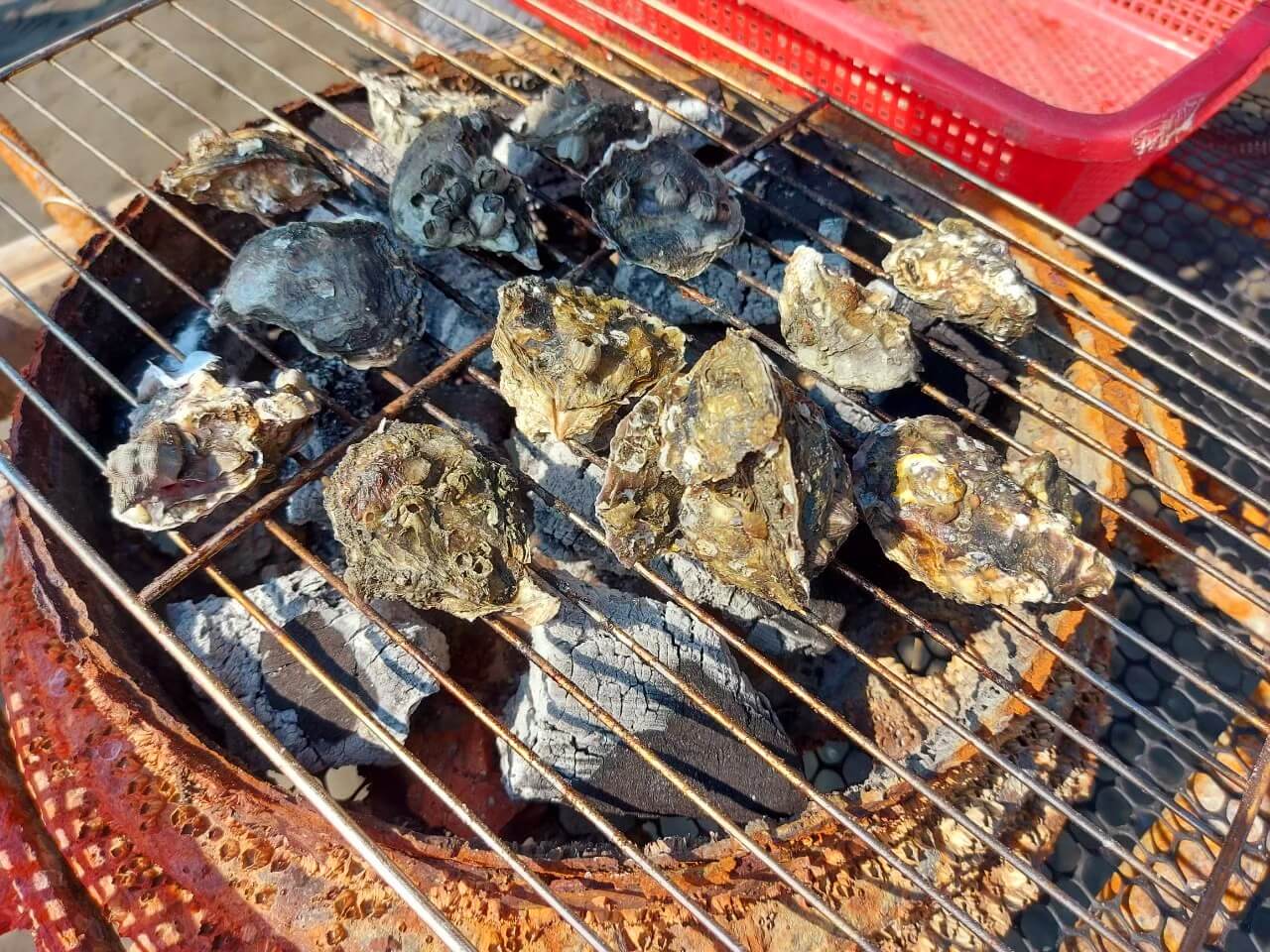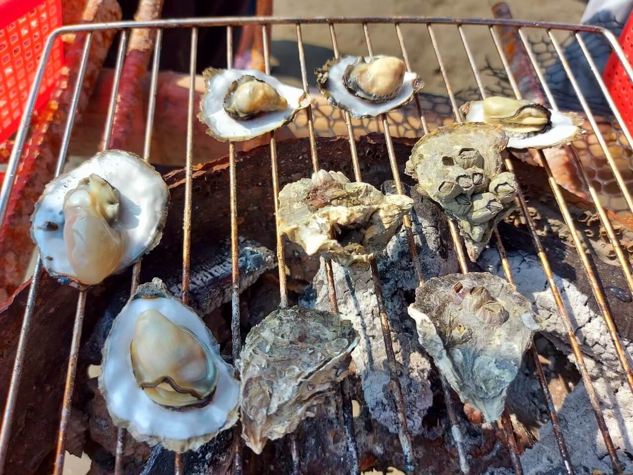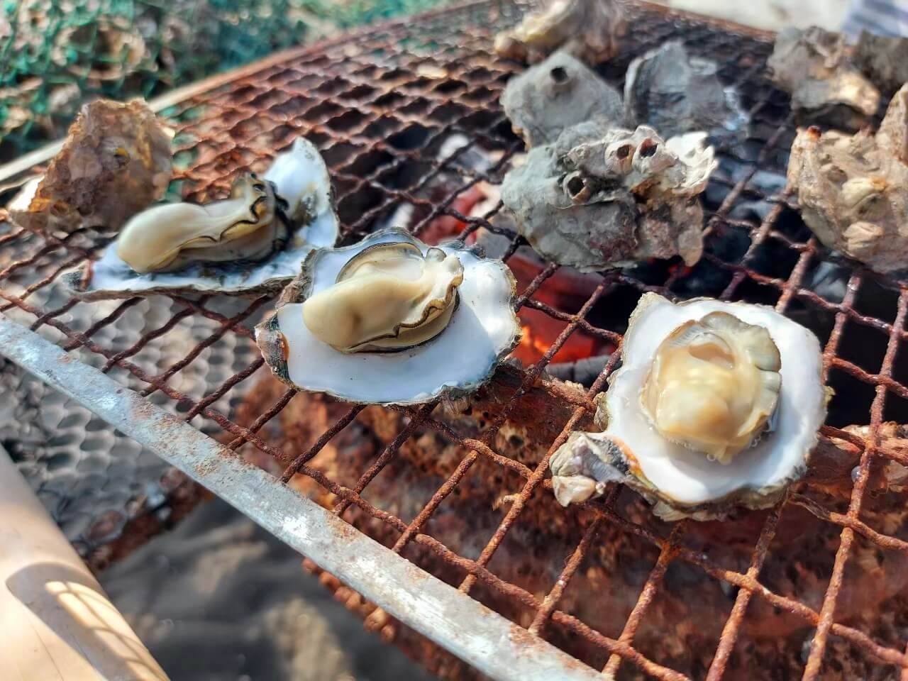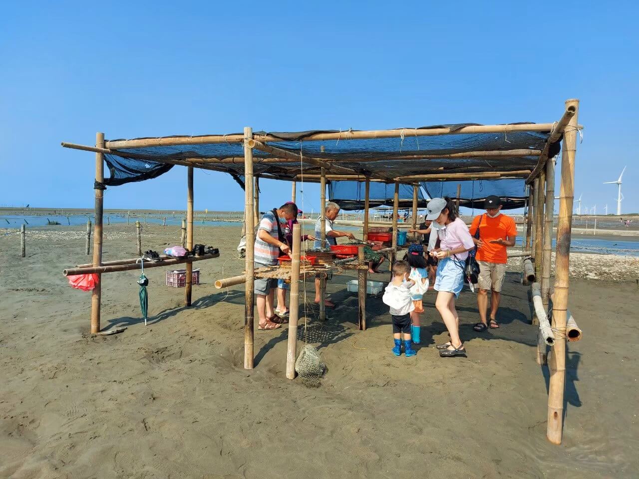 放棄挖蛤以後,我們回到他們自己搭建的棚子下,準備來一頓生蚵大餐,生蚵是無限量供應的,能吃多少就吃多少