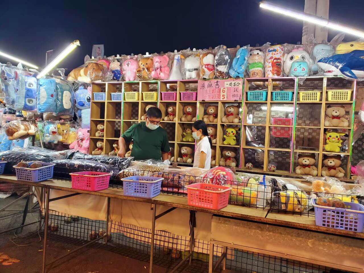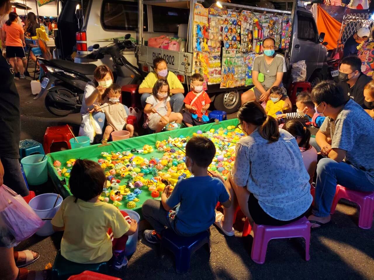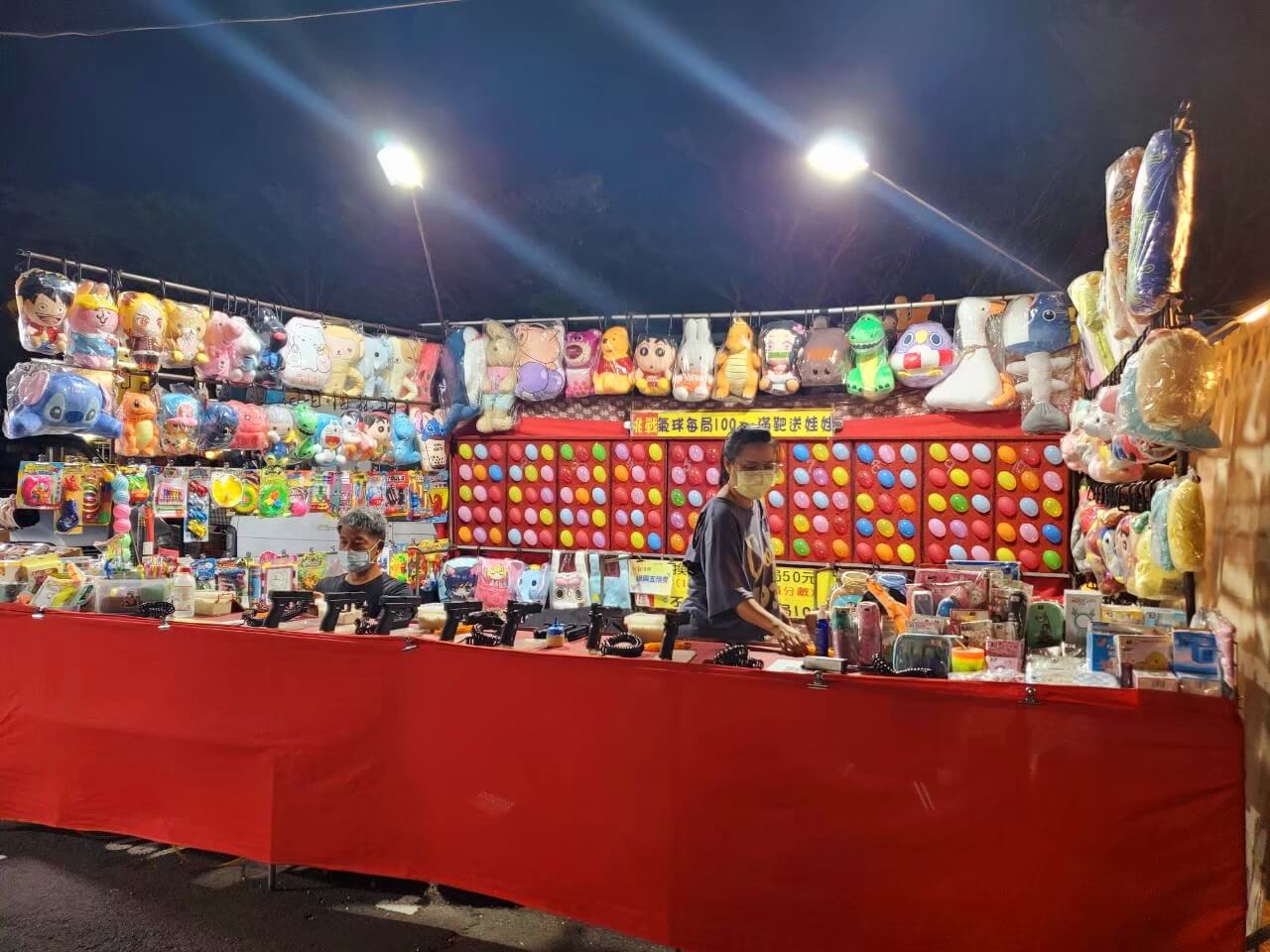 除了充氣城堡,彰化景點 精誠夜市裡也有常見的玩樂攤販:射氣球、套圈圈、丟棒球、10元打香腸等等,還有很多小朋友喜歡的畫畫和釣玩具鴨子
