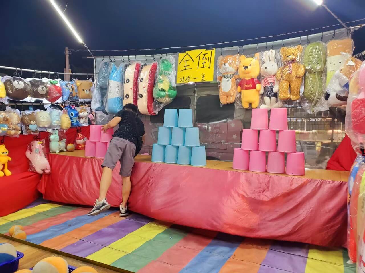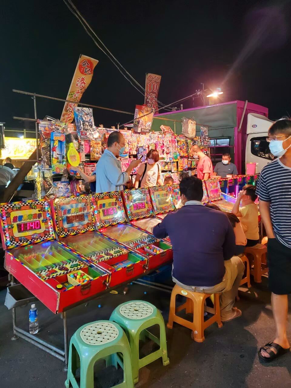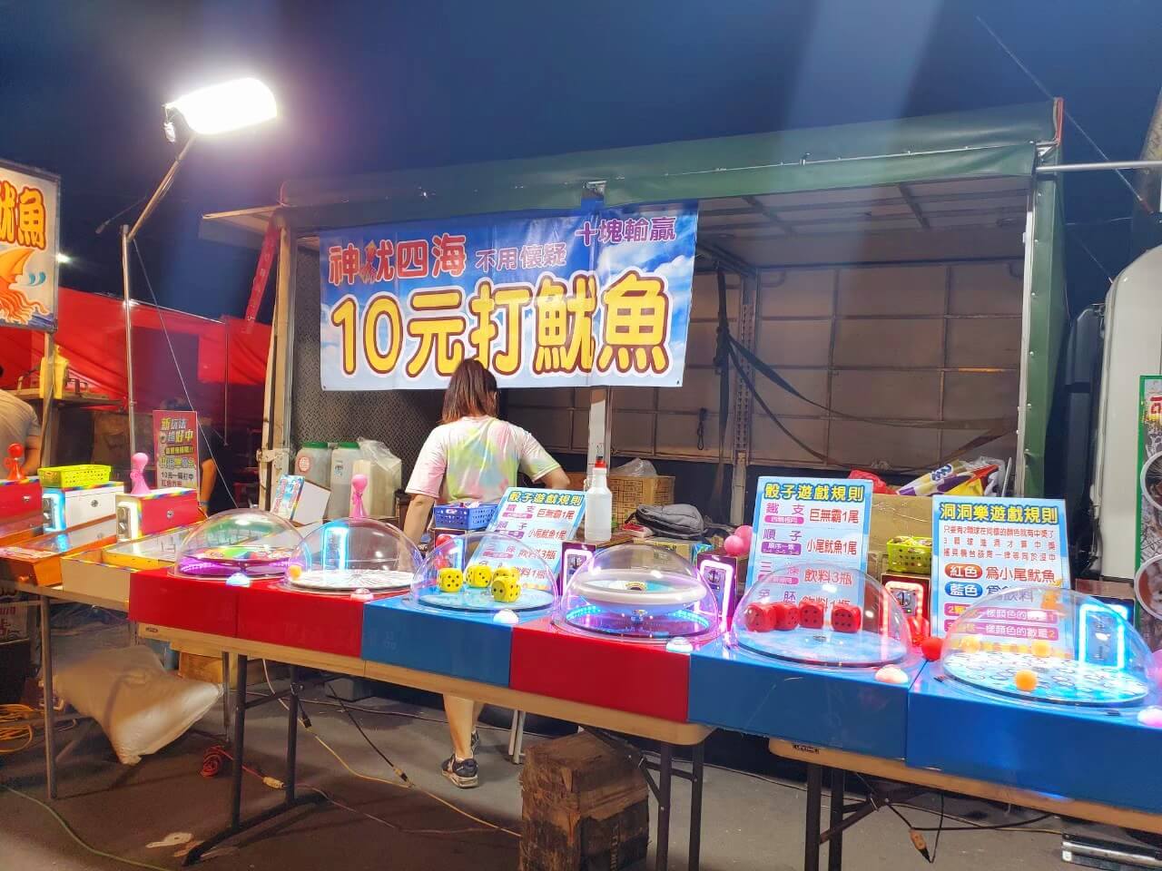 除了充氣城堡,彰化景點 精誠夜市裡也有常見的玩樂攤販:射氣球、套圈圈、丟棒球、10元打香腸等等,還有很多小朋友喜歡的畫畫和釣玩具鴨子