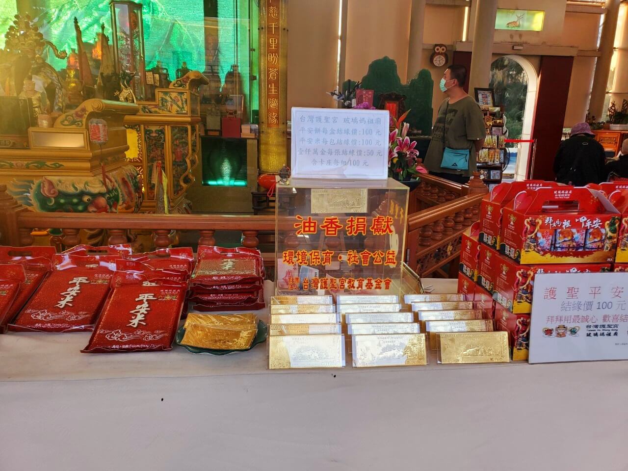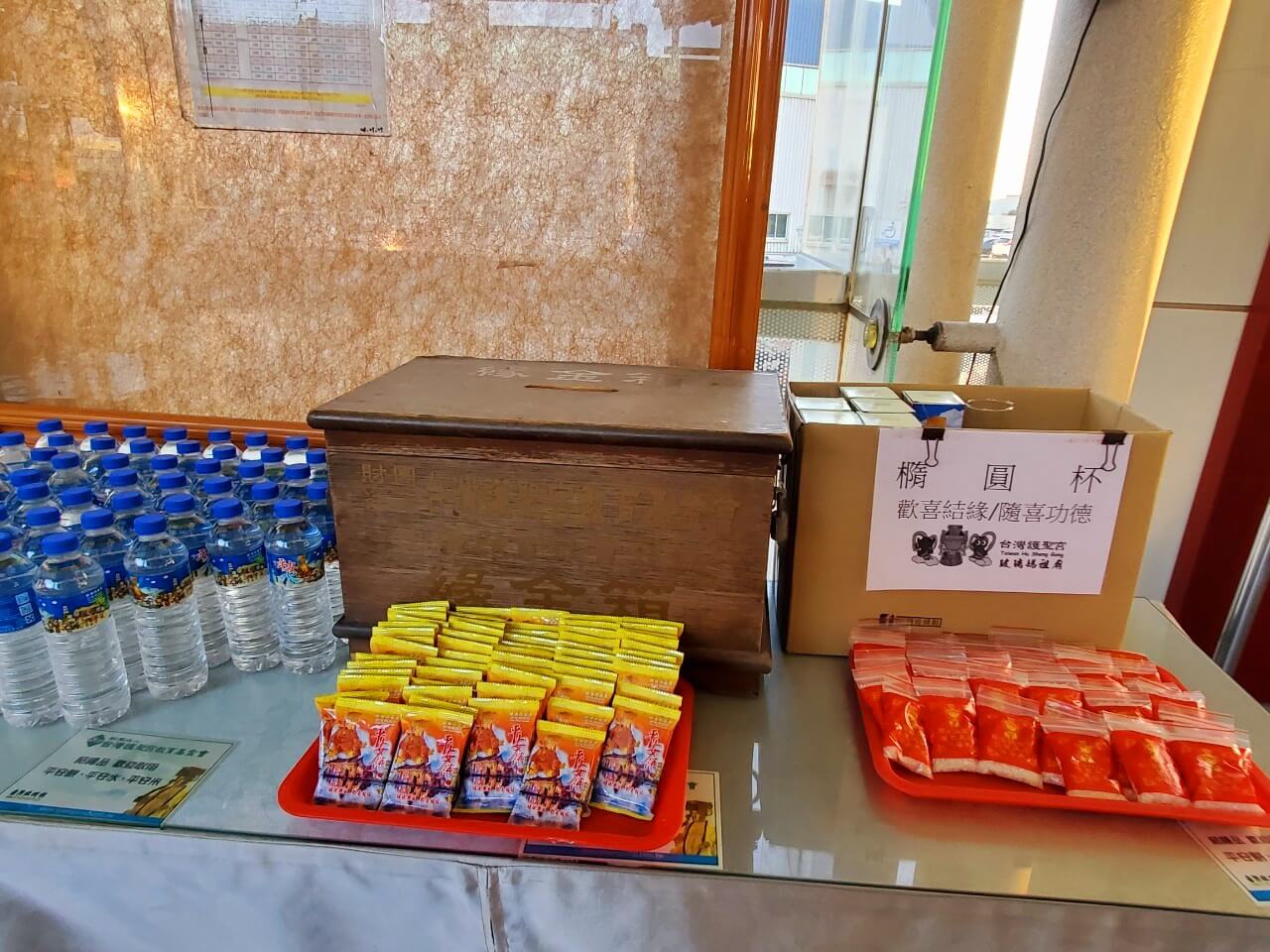玻璃媽祖廟參拜沒有規定的油香錢,這裡都是隨喜,也可以拿取平安水和平安餅,因為玻璃媽祖廟是用玻璃打造而成的,天氣好的時候,陽光灑落下來看起來很漂亮,而當夕陽西下的時候,又是另種不同的風味