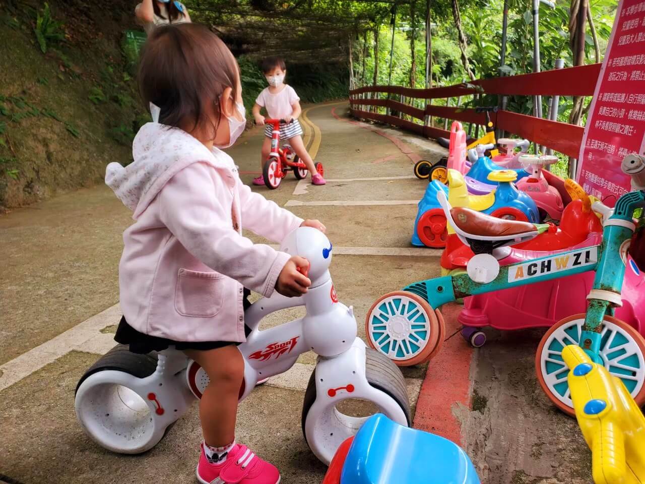 順著坡道走,來到了新北景點 桃樂絲森林特別為小朋友打造的兒童車道,這裡提供了好幾輛兒童平衡車,都可以免費讓小朋友遊玩