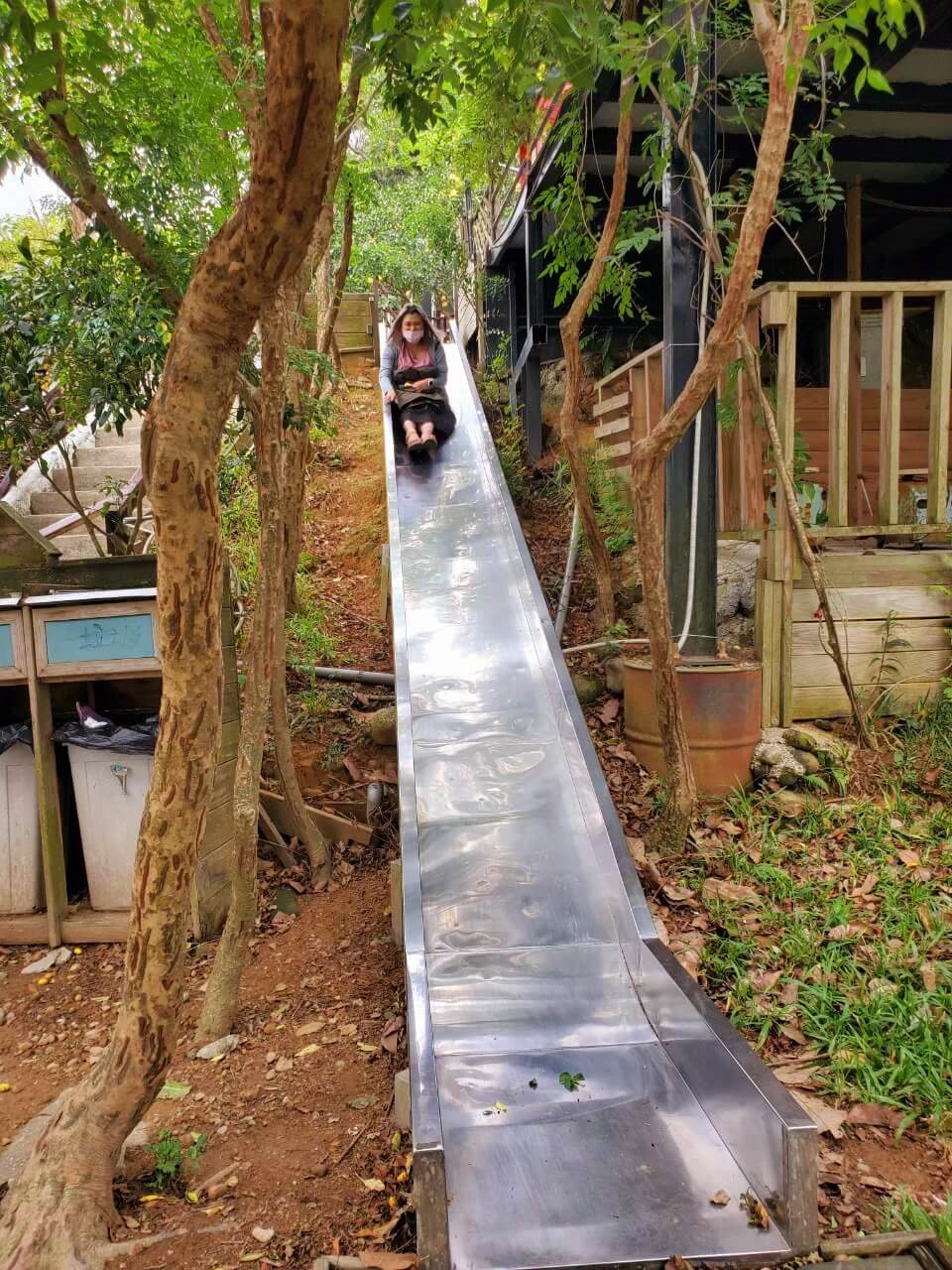 在攤車旁邊有一個鐵製的溜滑梯,可以溜下去到下方的空地,這塊空地有放養的雞和鵝,也有放置兒童的搖搖馬,雖然空地很大,但是沒辦法讓小朋友在這邊奔跑,因為放養的鵝實在太兇了,會主動跑來攻擊人