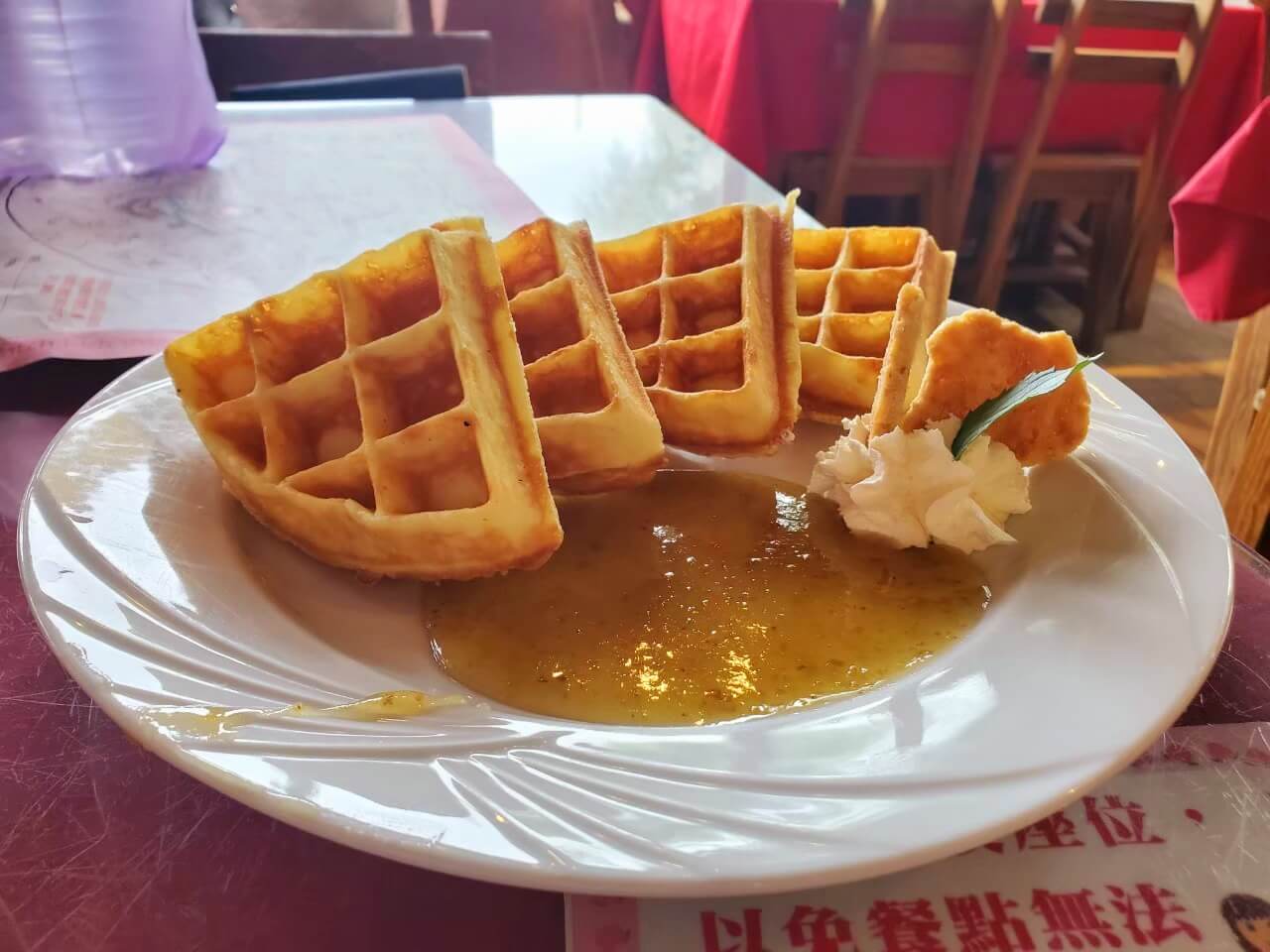 新北景點 桃樂絲森林的餐點選擇算蠻多的,而且價錢也不貴,我們當天點了一份柚子醬鬆餅和柚香炸雞套餐,沒有一樣是踩雷的