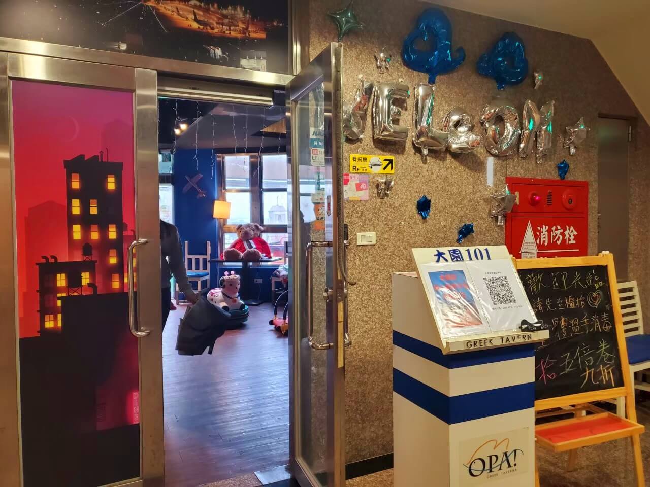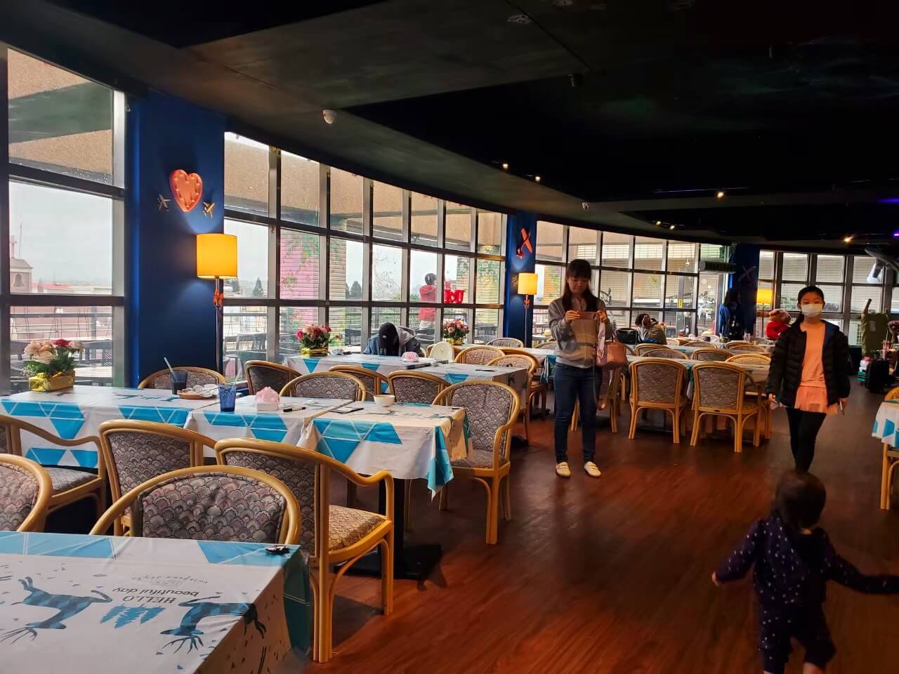 桃園景點 大園101景觀餐廳的室內座位區不大,整體是以藍白色系為主,仔細看的話,可以看到天花板另有巧思,畫上星空和飛機,像是在夜空下吃飯