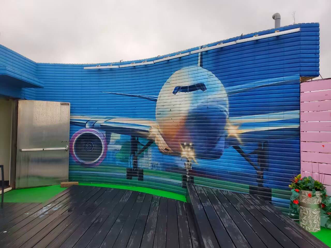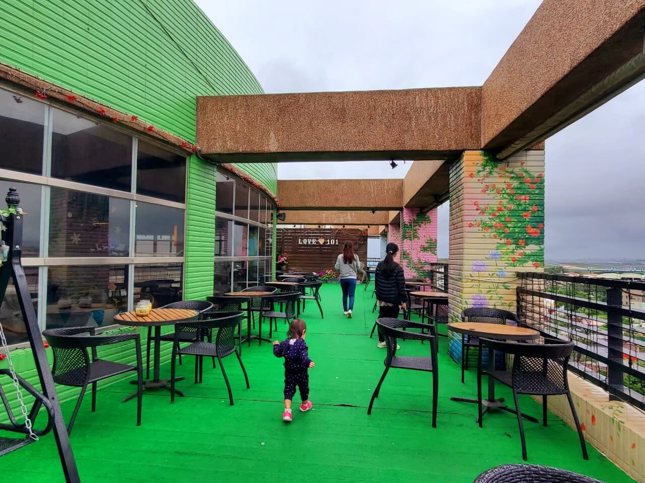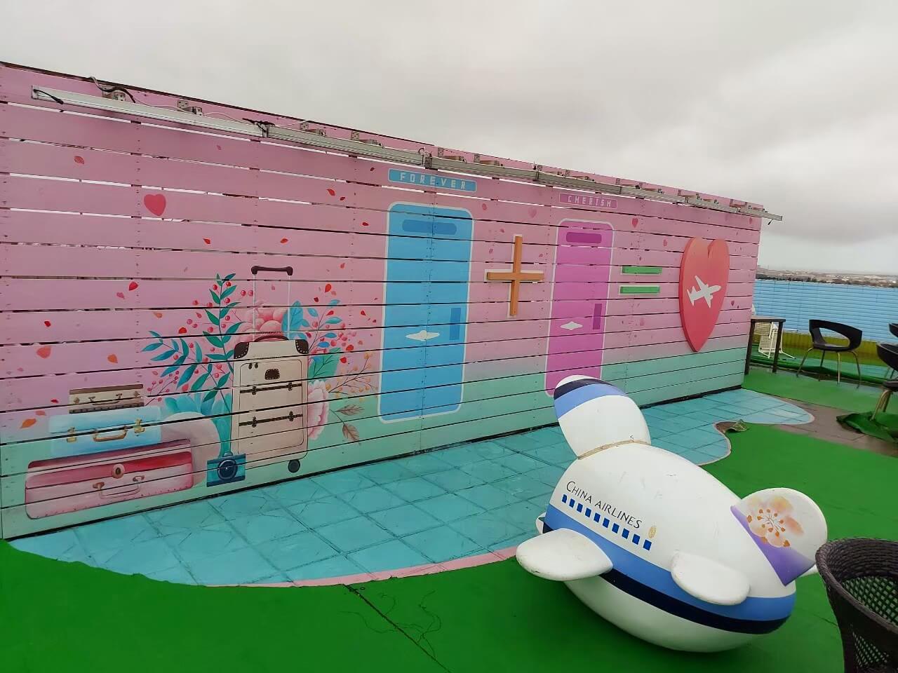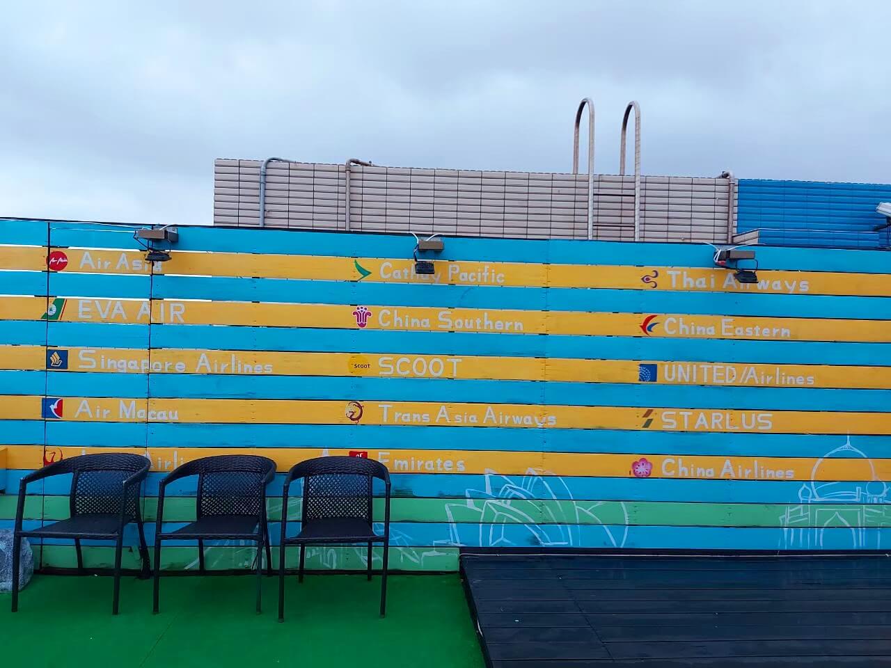 桃園景點 大園101景觀餐廳還可以上去頂樓的地方賞飛機,而且頂樓的部分也有特別整理過,牆上滿多關於飛機的插畫,是一處蠻好拍的地方