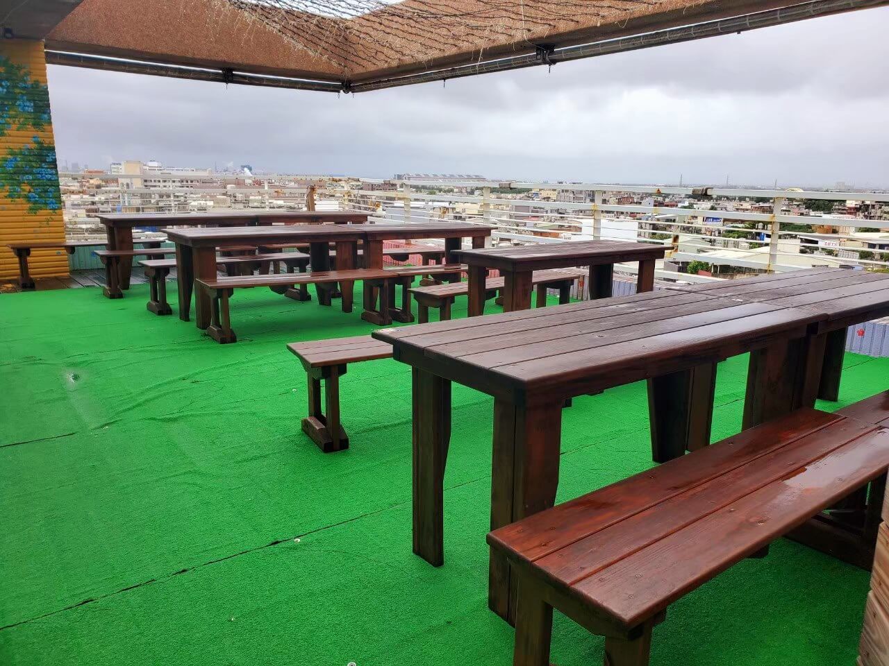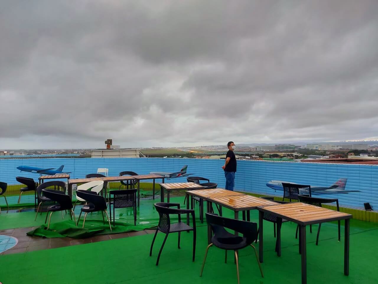 頂樓也有擺放桌椅,可以帶著飲料坐在這裡等著飛機飛過,雖然因為沒有遮蔽物所以視野很好還可以看到遠方的飛機跑道,但是遇到天氣不好的時候,來這邊賞飛機就沒有屋簷躲雨