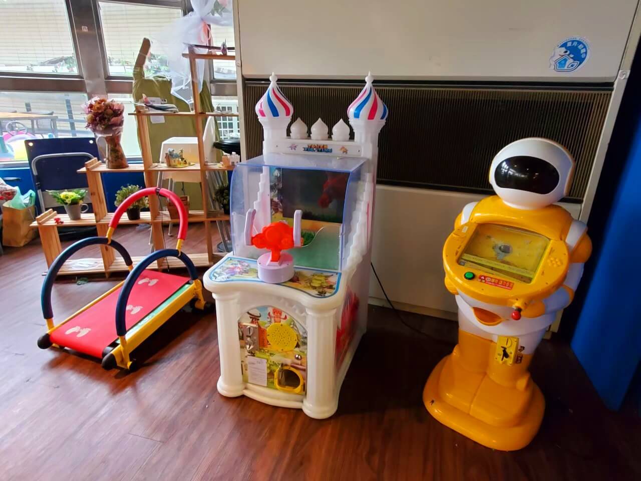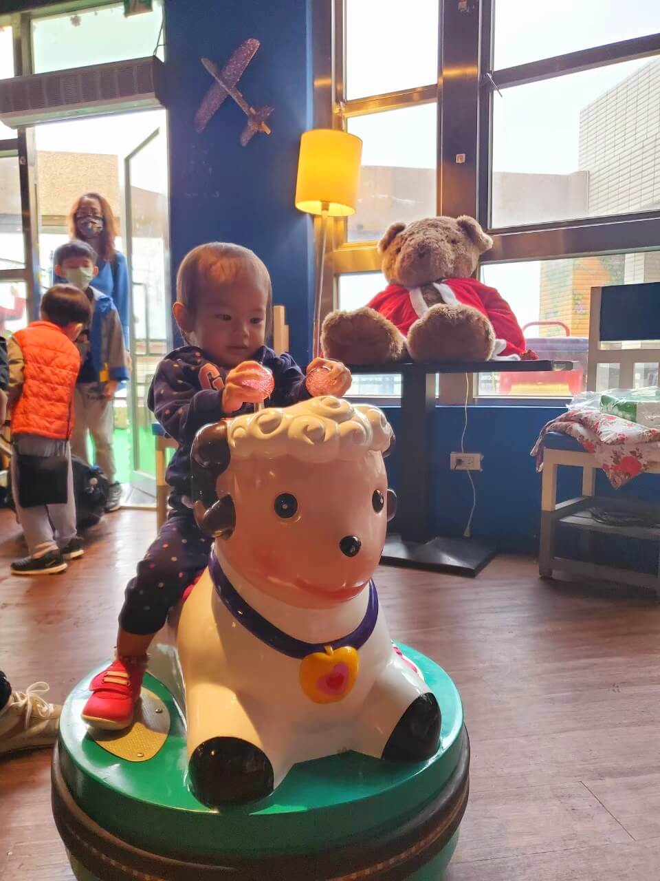 在室內座位區旁邊,還有幾台小朋友的遊戲機,不過當天我們到訪的時候,機台沒有插電,連遙控小羊都無法使用,就只讓媛媛坐在上面過過乾癮