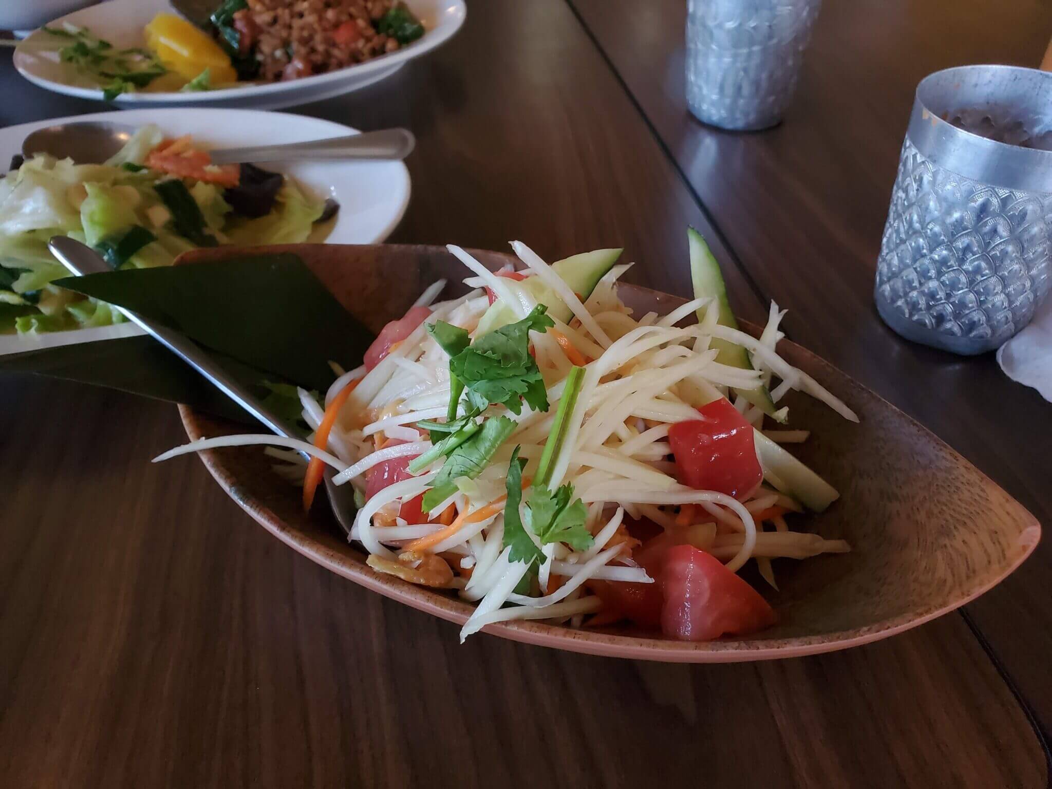 我們當天點了一份2~3人份套餐,泰式經典的菜色都吃得到,有青木瓜沙拉、泰式椒麻雞、打拋豬肉、蝦餅等等,飲料則是選擇了泰式奶茶,我們還有另外加點了蝦片